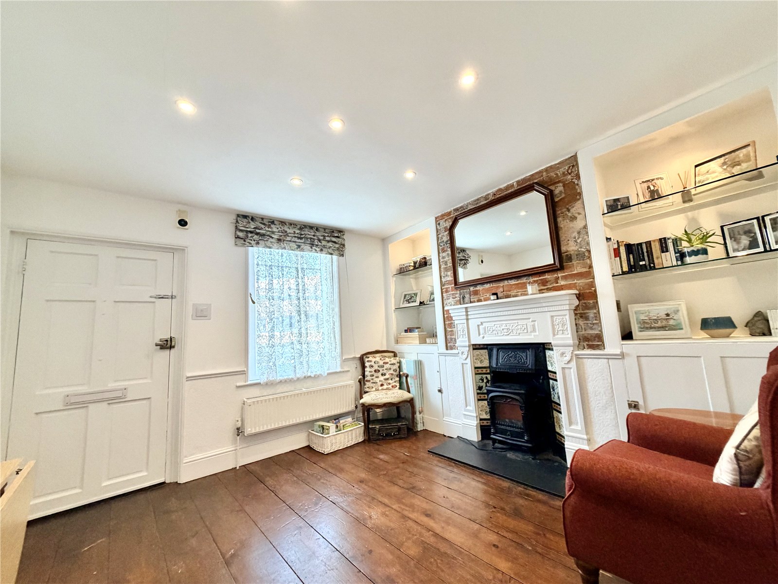 Front door to sitting room with cast iron fireplace with tile insets with display shelves to either side, exposed brick wall with stripped flooring. Kitchen which is attractively fitted with cupboards and drawers, butlers sink, hob and oven as well as dishwasher. Stairs to first floor with storage cupboards and a door to the outside and garden.