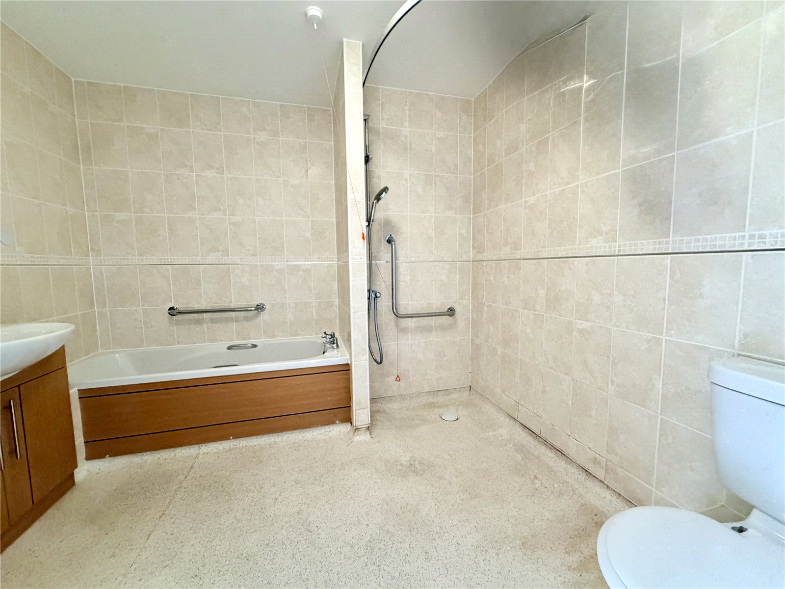 Comprising bath, wc, wash basin and wet room style shower, electric heater.