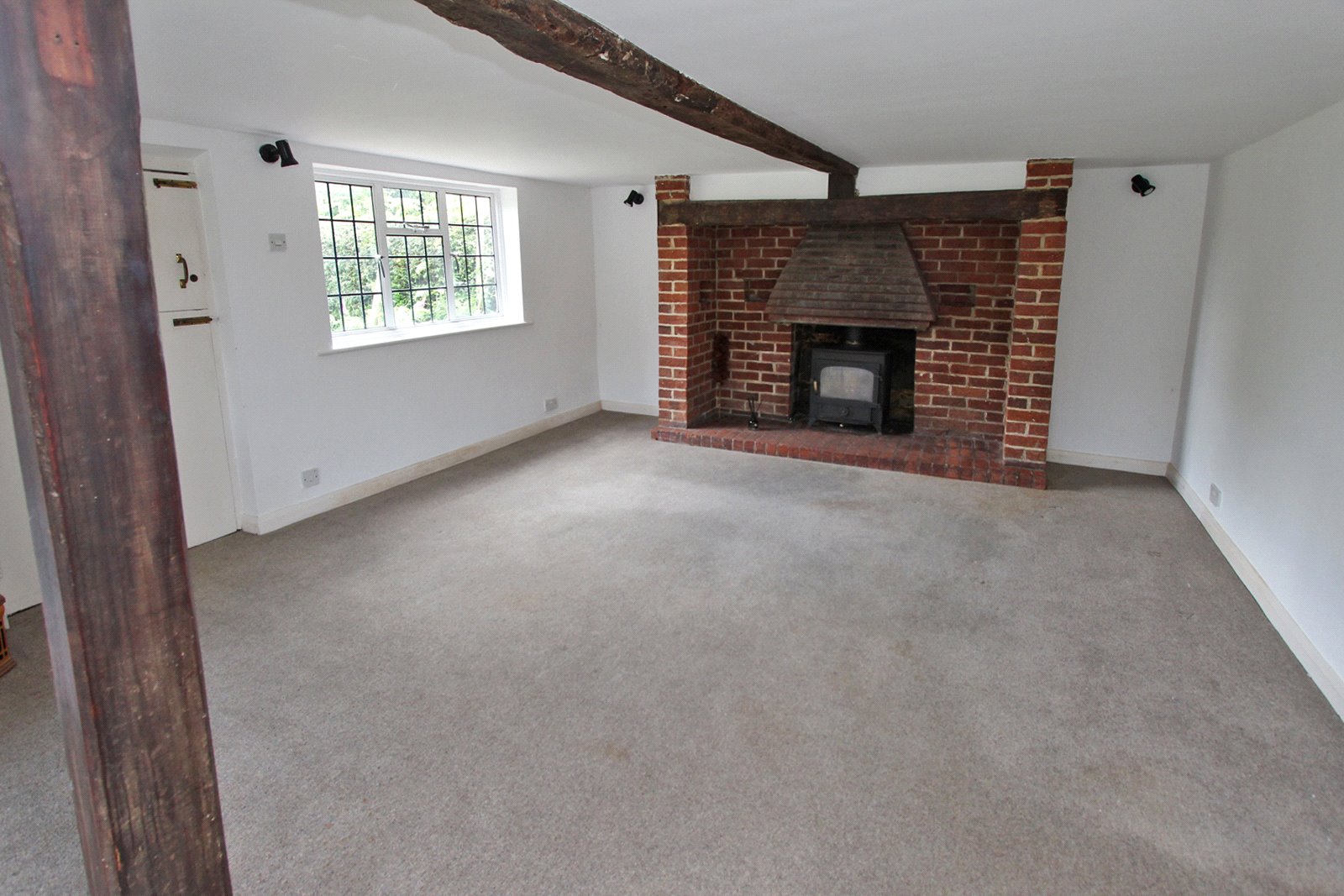 Plus bay, this room with its original beamed ceilings is a truly enchanting space, soaked in natural light from dual aspect leaded windows looking over the gardens. At one end of the room is a large inglenook fireplace with a tiled canopy and a woodburning stove adding warmth and character to the room. At the other, the bay window overlooks the mature gardens down to the forest beyond. An open staircase rises to the first floor. The room has wall lights and Dimplex wall-mounted night storage heaters. An old drop latch cottage door leads to the modern part of the house via an inner hallway.