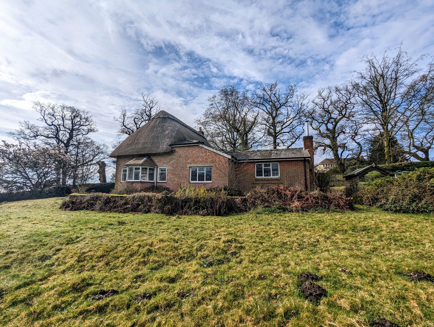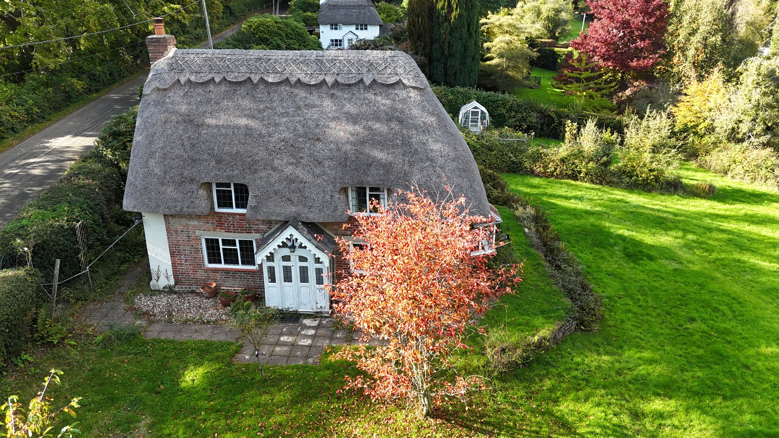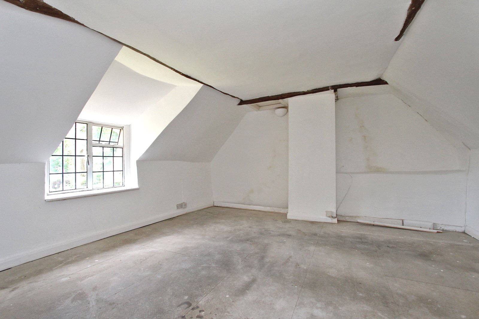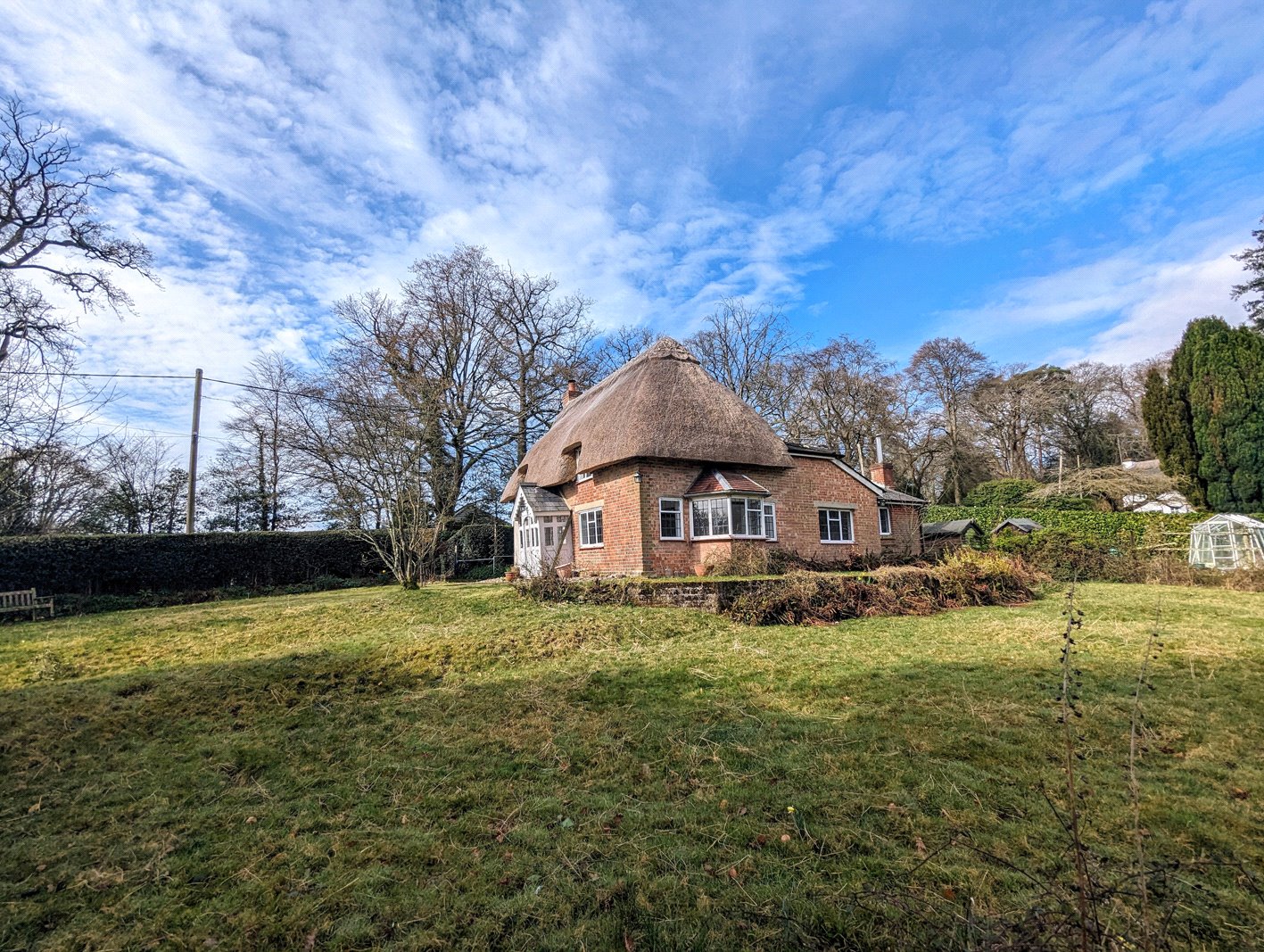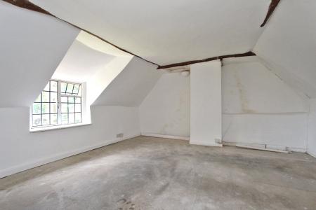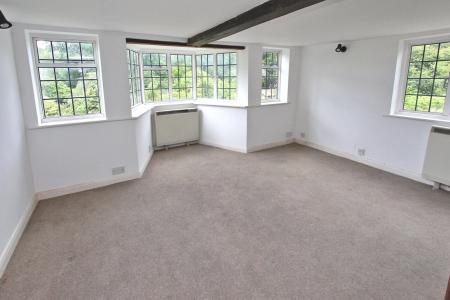 A leaded window peeping out from the thatch offers picturesque views over the garden to a village green. The room has slightly sloping ceilings, wall mounted light fittings and generous proportions.