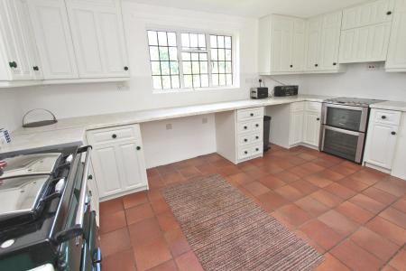 With terracotta tiled floor and double aspect windows offering views to the gardens and forest on one side and the courtyard on the other, this is a light and generous space. A back door provides direct access to the courtyard area providing a convenient al fresco dining area and practical alternative entranceway. With an oil fired Rayburn stove surrounded by an extensive range of kitchen units with drawers and cupboards, roll-top work-surfaces, ceramic splashbacks, and ample space for appliances and a family kitchen table this could be described as a home cook’s paradise. The room also includes a separate electric cooker with a concealed extractor fan.