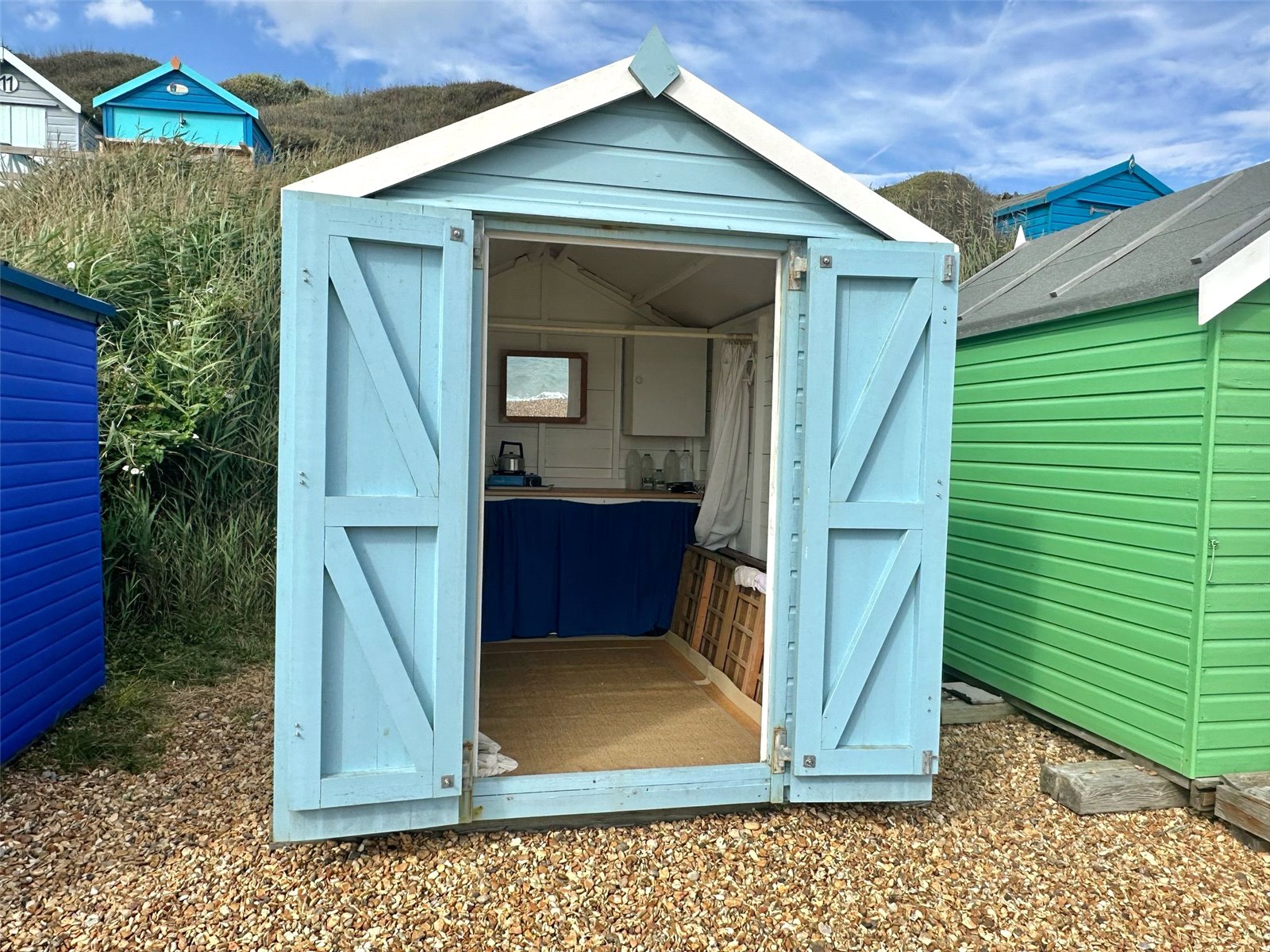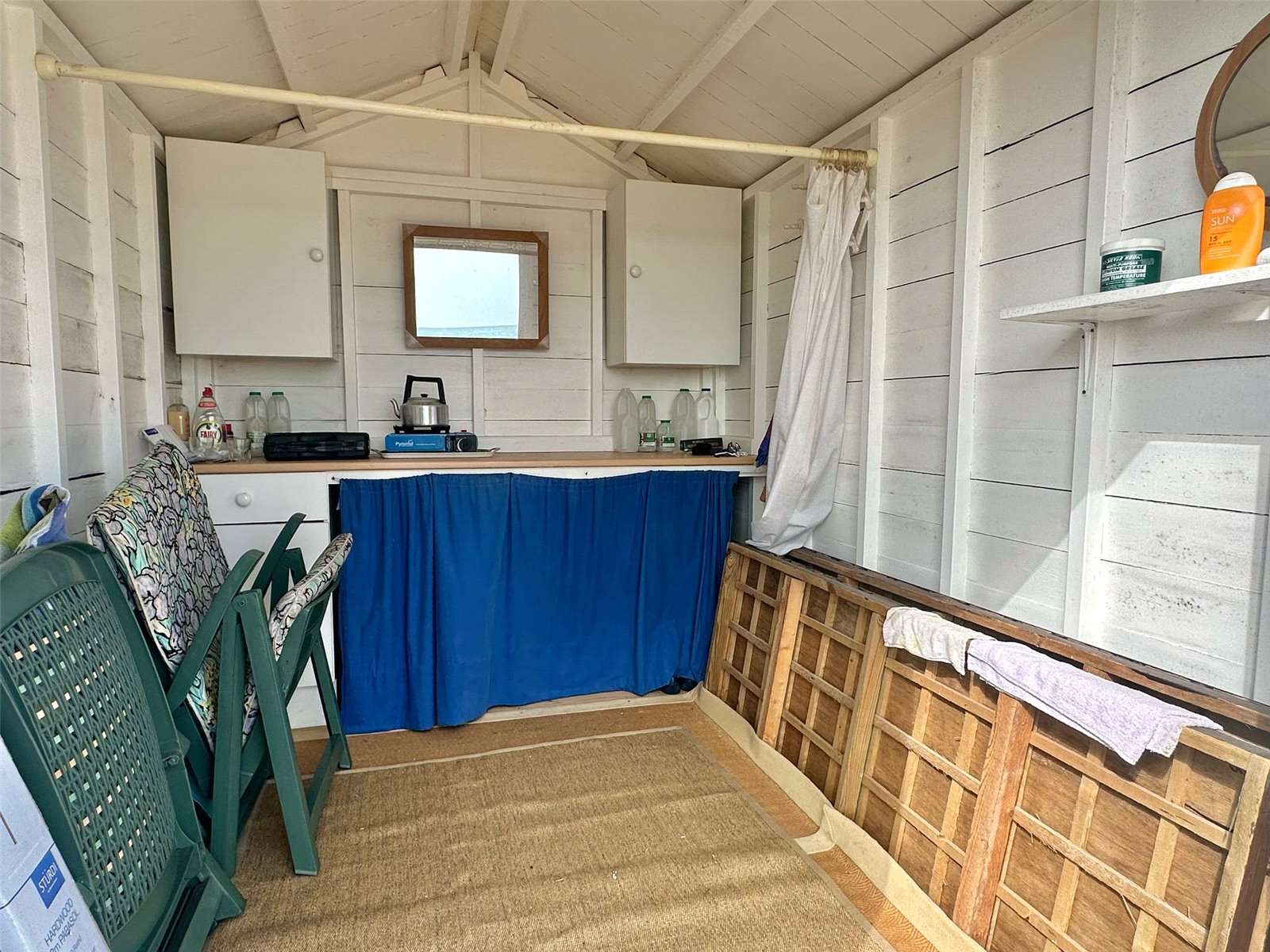 Located at beach level towards the far western end of the beach with a 180 degree vista from Hurst Castle, the Isle of Wight and the Needles in the East, to Christchurch and Bournemouth Bays in the West, with double opening doors, fitted work surface, cupboard and drawer below, and two eye level cupboard units