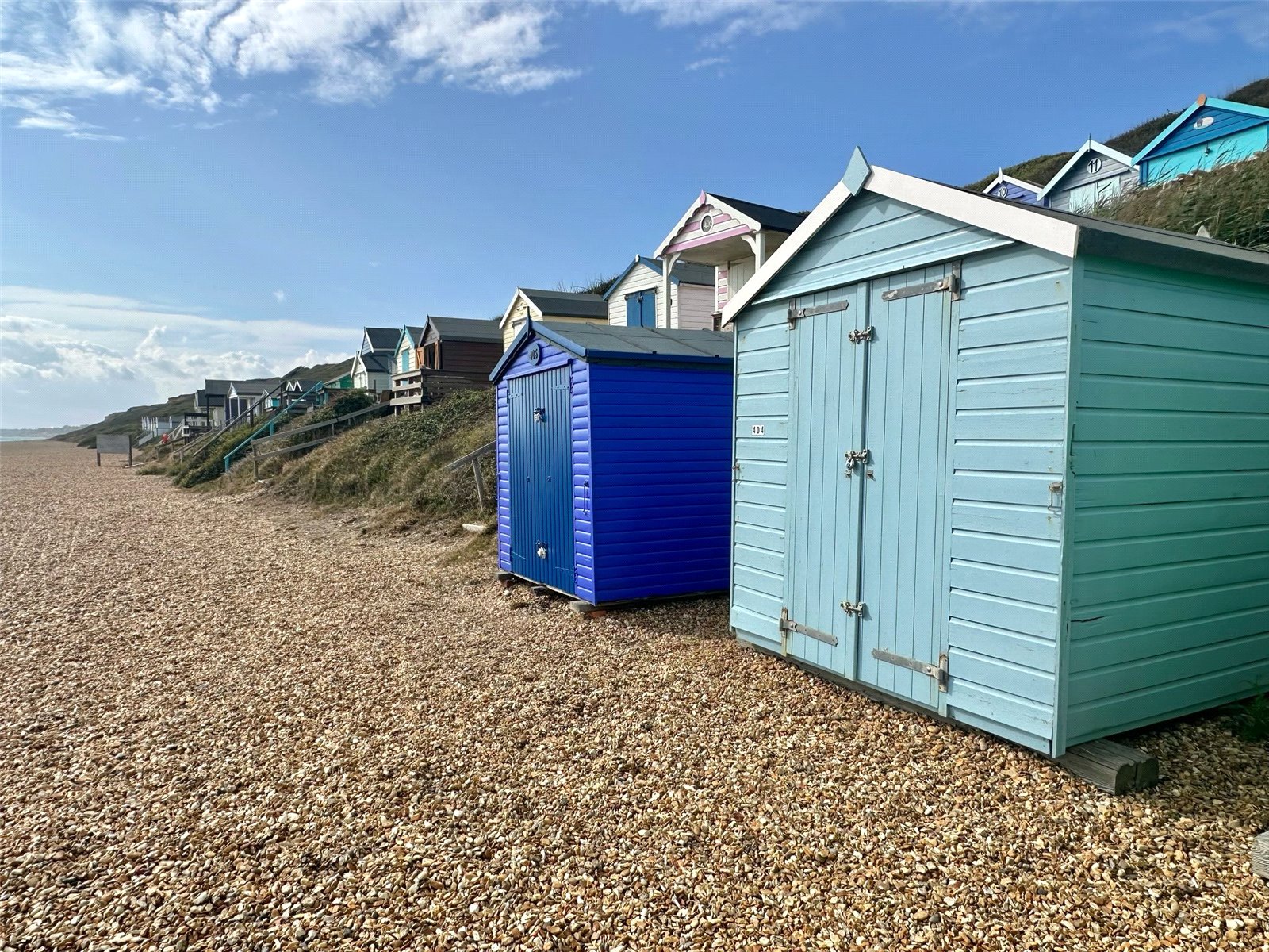 From the clifftop Kiosk Car Park head away from Milford village in a westerly direction, take the last set of steps down to beach level, and No. 404 will be found just to your right hand side