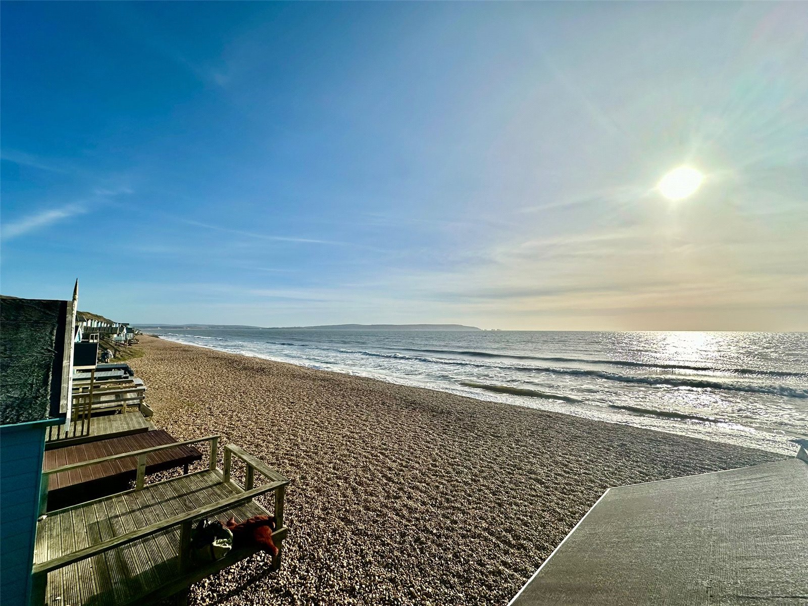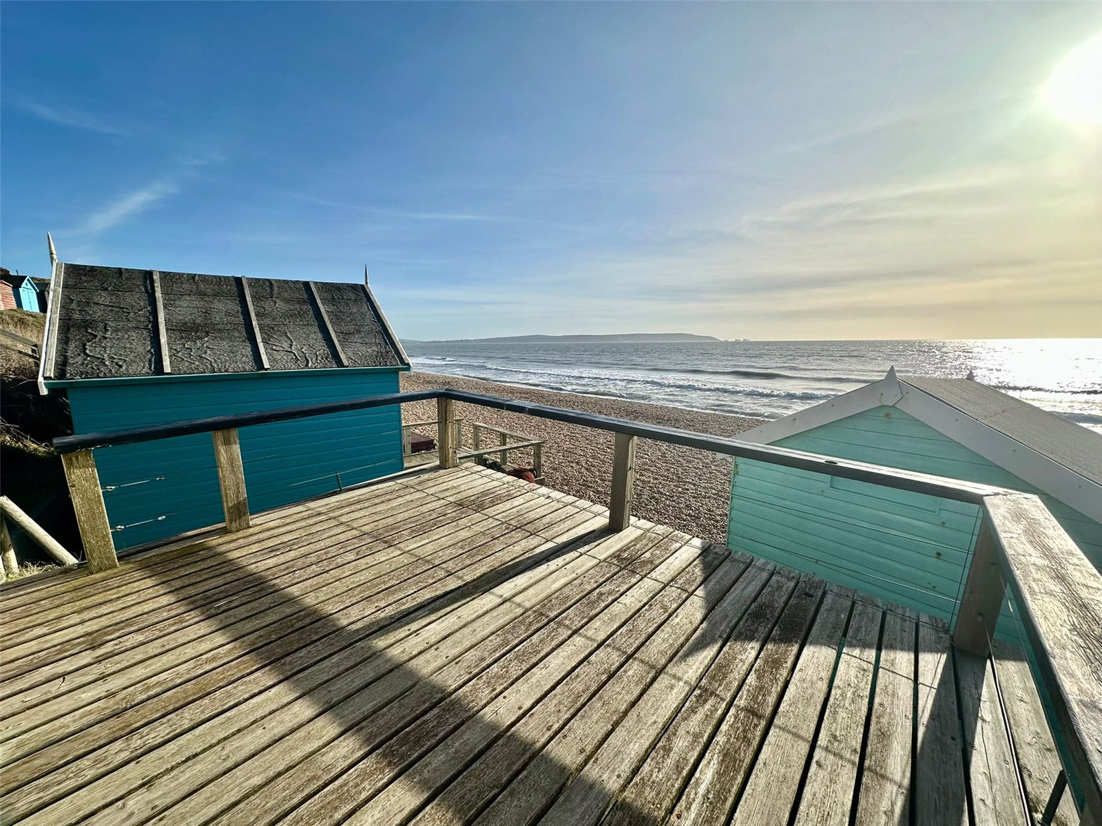 A beach hut with stunning views of the coastline and Isle of Wight sitting in an elevated position with large terrace