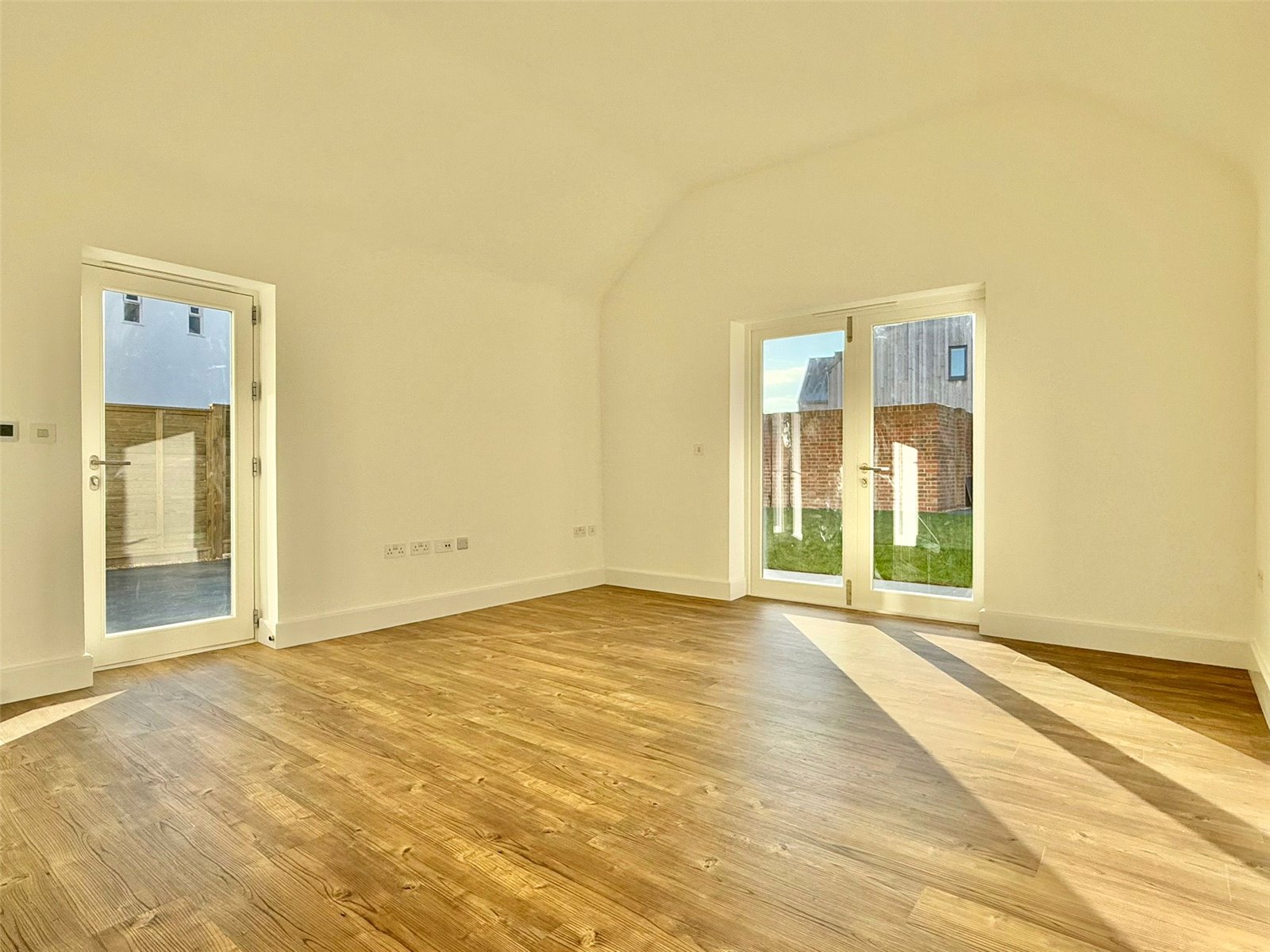 SITTING ROOM with dual aspect glazed patio doors overlooking and leading out on to the south facing rear garden, feature high vaulted ceiling, ceiling light point and three lamp socket