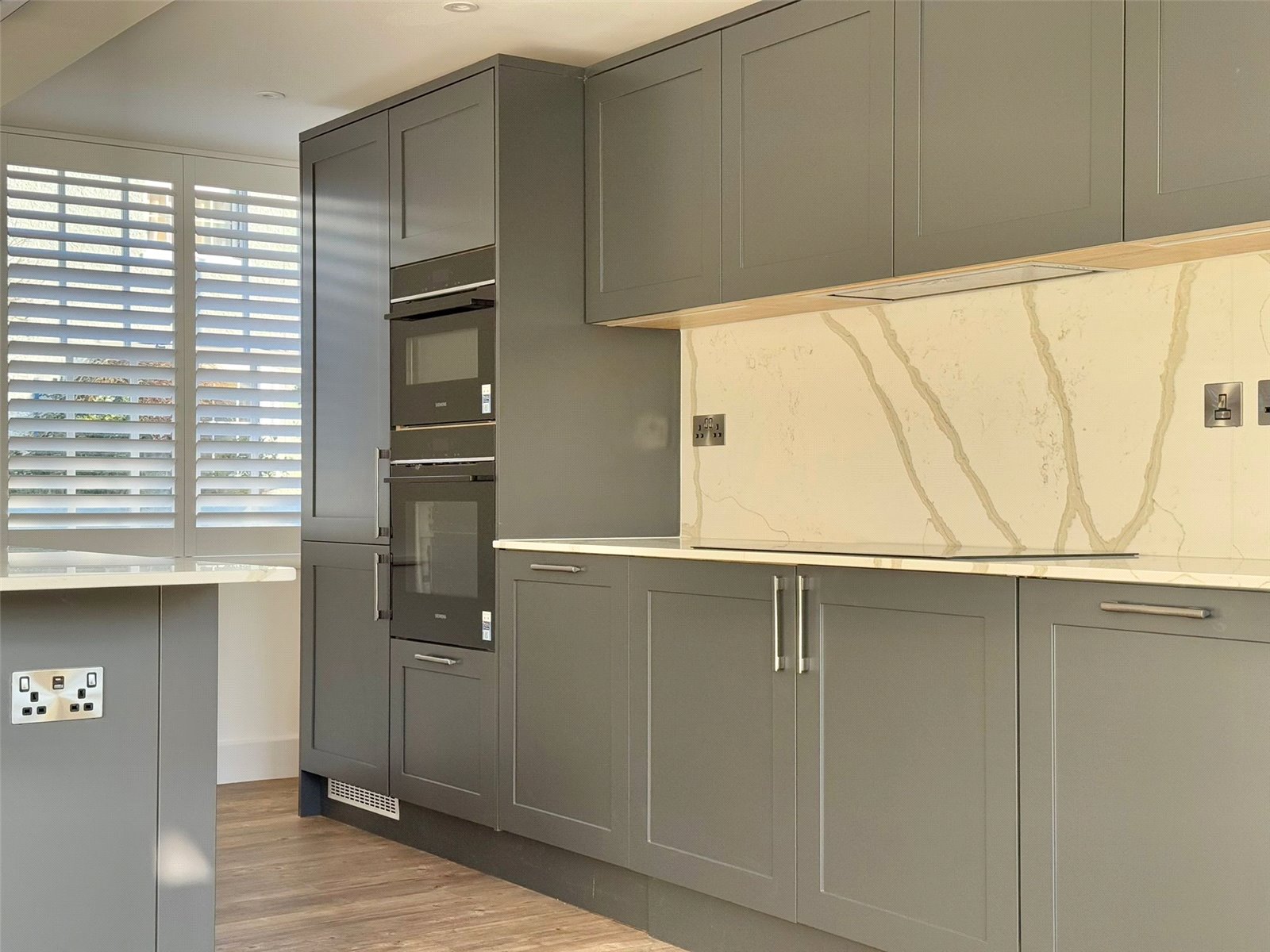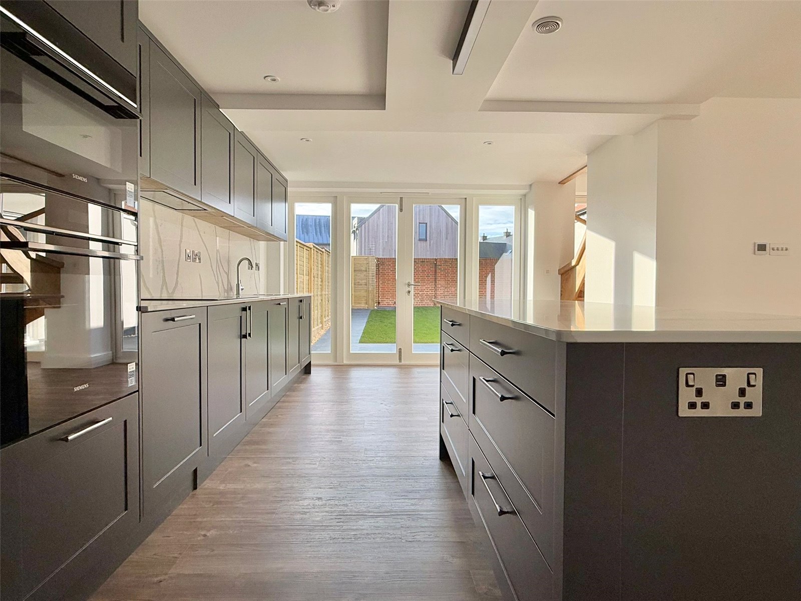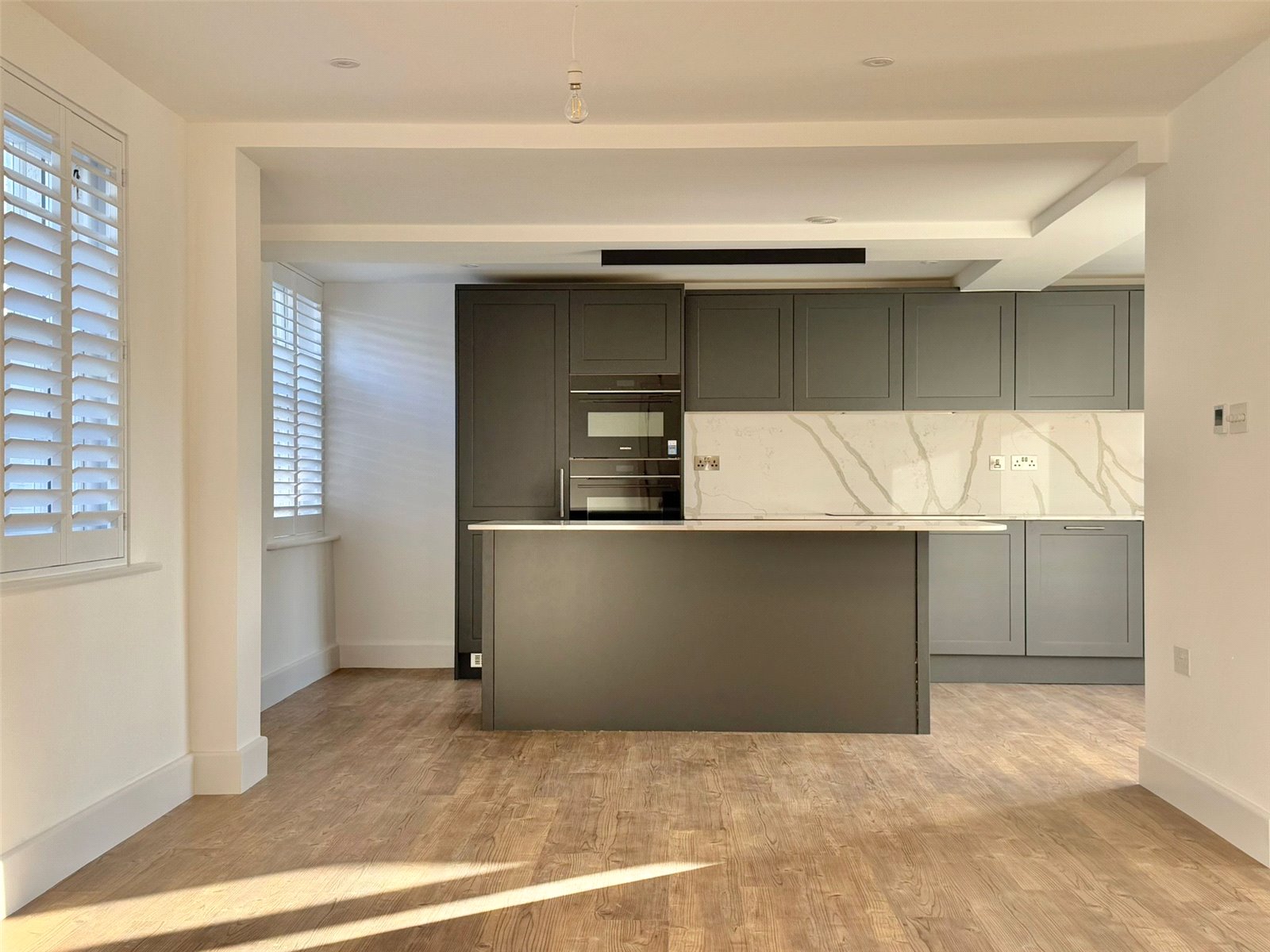 Sash windows overlooking the front aspect with fitted plantation shutters, two new patio doors overlooking the south facing rear garden, recessed ceiling spotlighting and further downlighting, Amtico flooring with underfloor heating throughout. The superbly appointed contemporary kitchen comprising soft close cabinet doors and drawer units, with matching eye level cupboard units, Blanco undermount stainless steel sink unit with Blanco brushed chrome mixer taps set in a Quartz worksurface with Quartz splashback, under cabinet LED lighting and integrated appliances including Siemens lq700 8 multifunction single oven and Siemens lq700 Compact 45 combination multi-function microwave and grill, Siemens lq100 black glass 5 zone induction hob, Siemens lq300 fully integrated dishwasher, Siemens lq100 full height larder fridge/freezer, large breakfast bar with contemporary lighting above, two storage cupboards, door leading to: