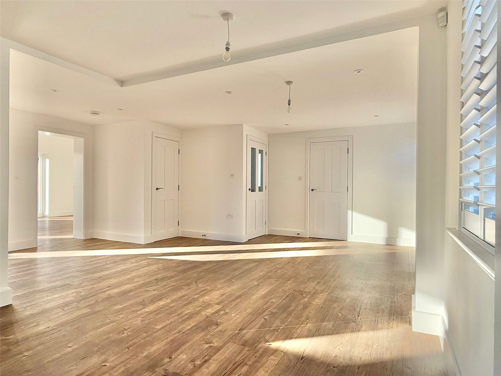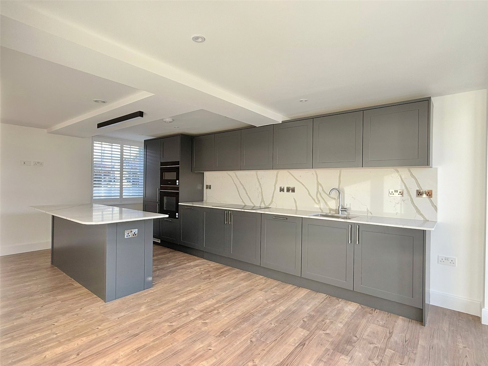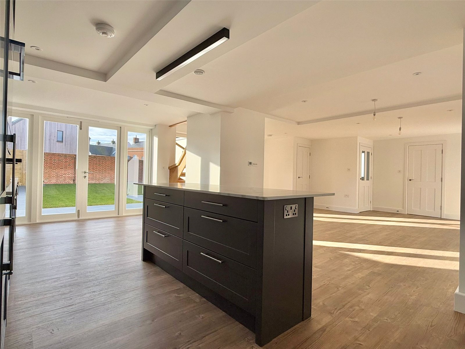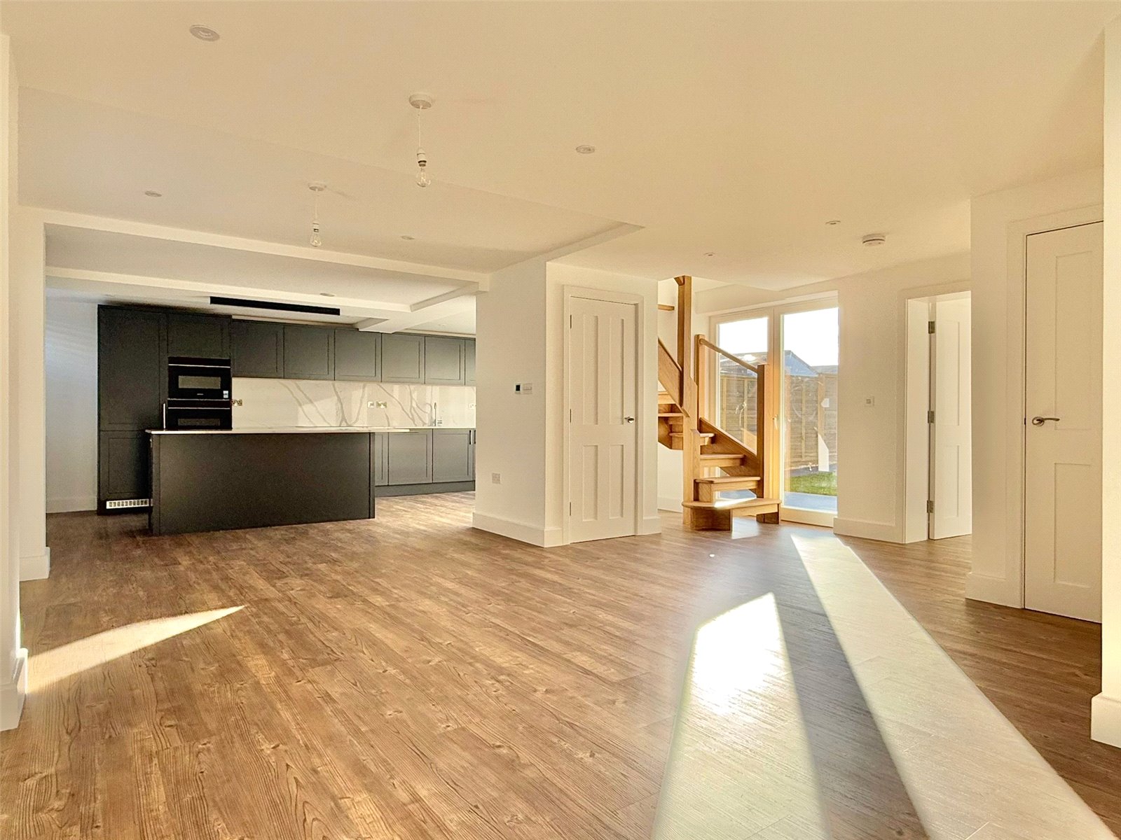 Sash windows overlooking the front aspect with fitted plantation shutters, two new patio doors overlooking the south facing rear garden, recessed ceiling spotlighting and further downlighting, Amtico flooring with underfloor heating throughout. The superbly appointed contemporary kitchen comprising soft close cabinet doors and drawer units, with matching eye level cupboard units, Blanco undermount stainless steel sink unit with Blanco brushed chrome mixer taps set in a Quartz worksurface with Quartz splashback, under cabinet LED lighting and integrated appliances including Siemens lq700 8 multifunction single oven and Siemens lq700 Compact 45 combination multi-function microwave and grill, Siemens lq100 black glass 5 zone induction hob, Siemens lq300 fully integrated dishwasher, Siemens lq100 full height larder fridge/freezer, large breakfast bar with contemporary lighting above, two storage cupboards, door leading to: