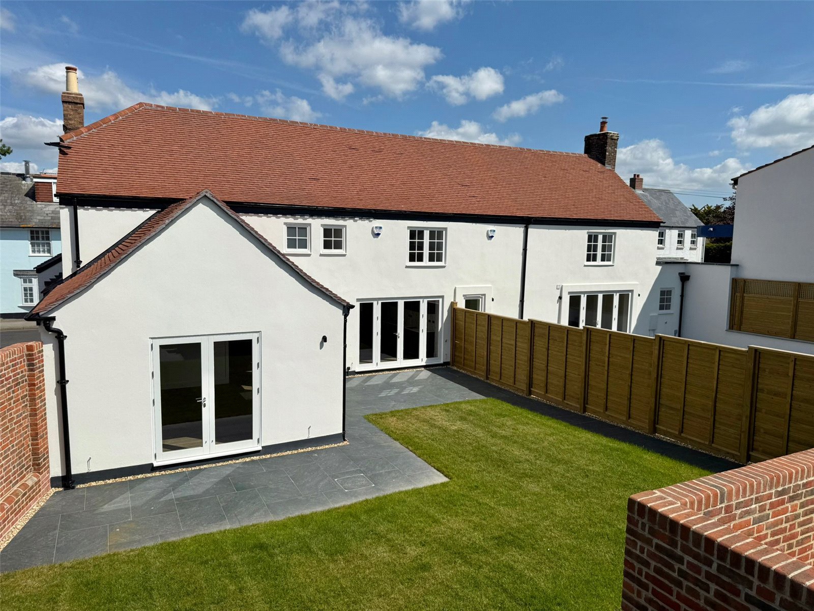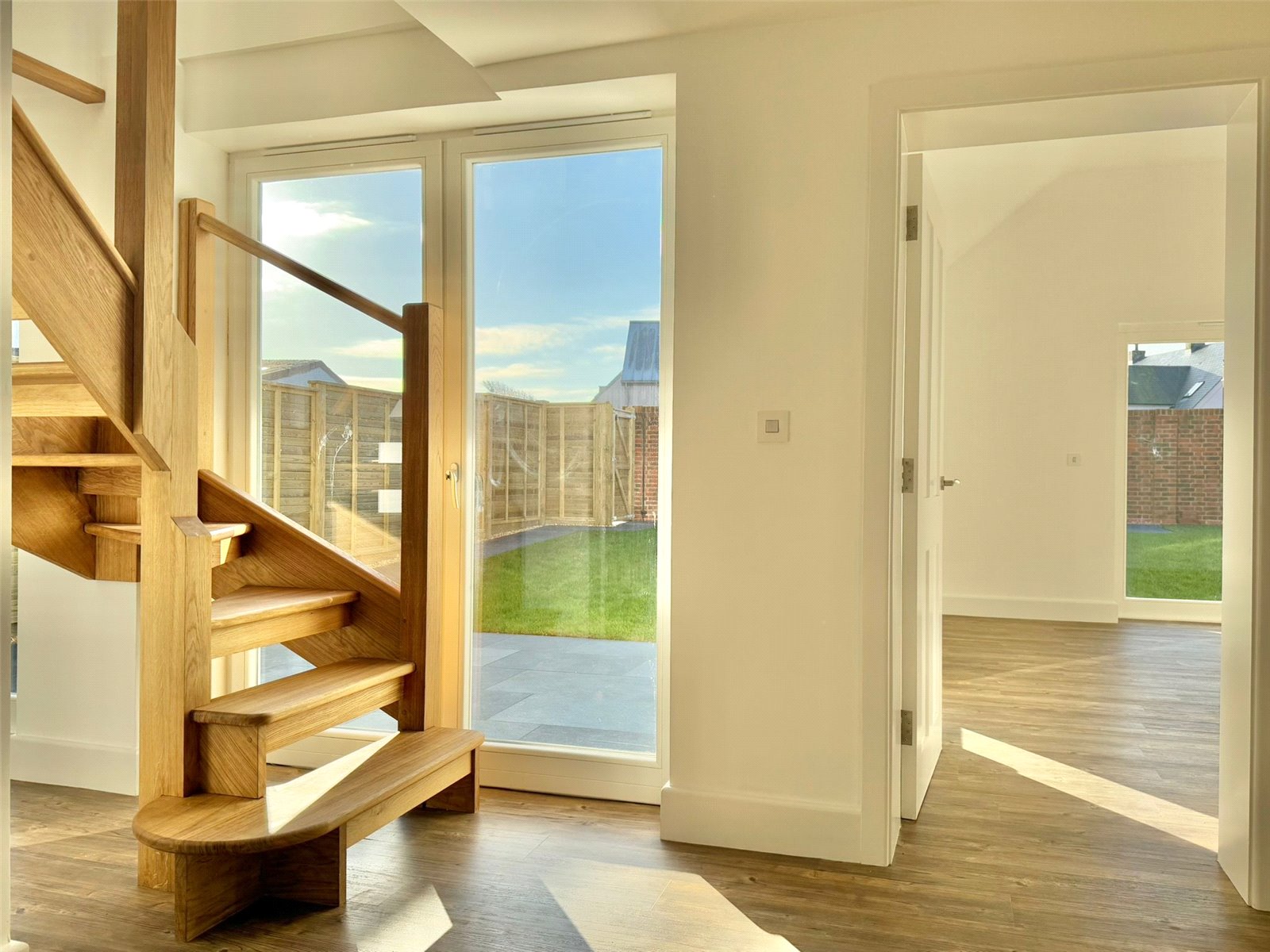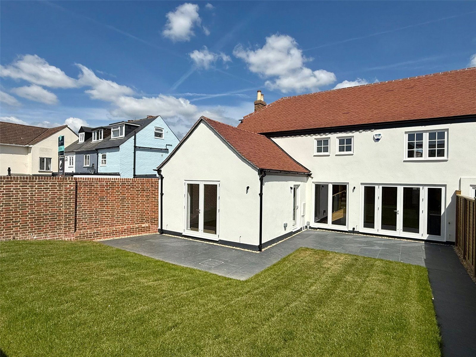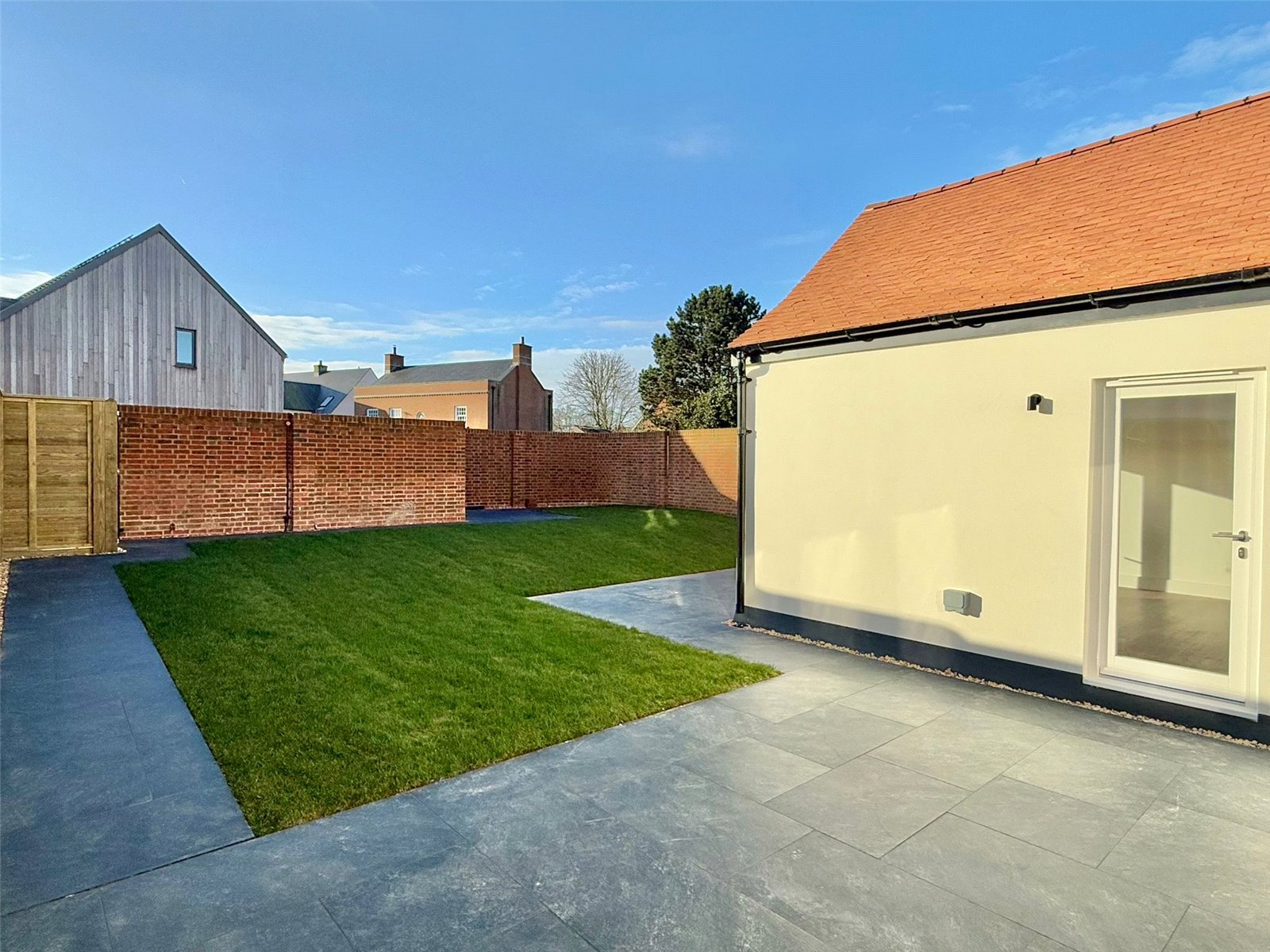 The landscaped south facing rear garden has been predominantly laid to lawn, two large private areas tiled with Porcelain tiles with direct access from the Kitchen/Living Space, secure bike storage and bin area, attractive wall and panel fenced boundaries.