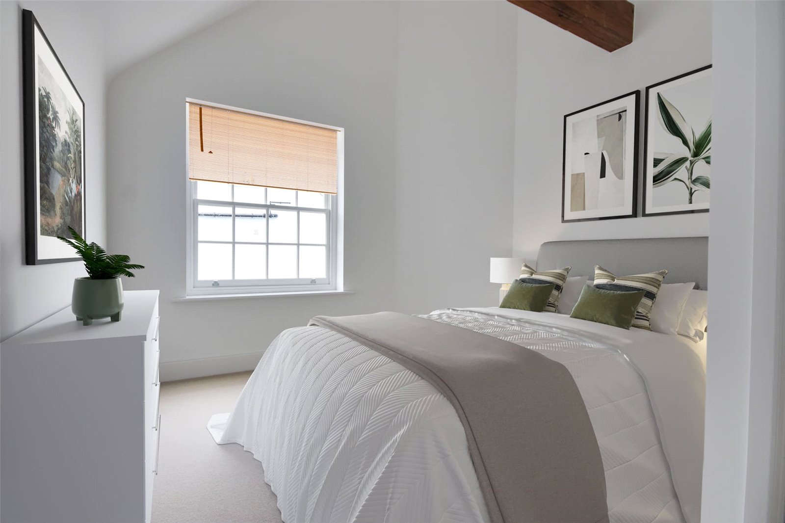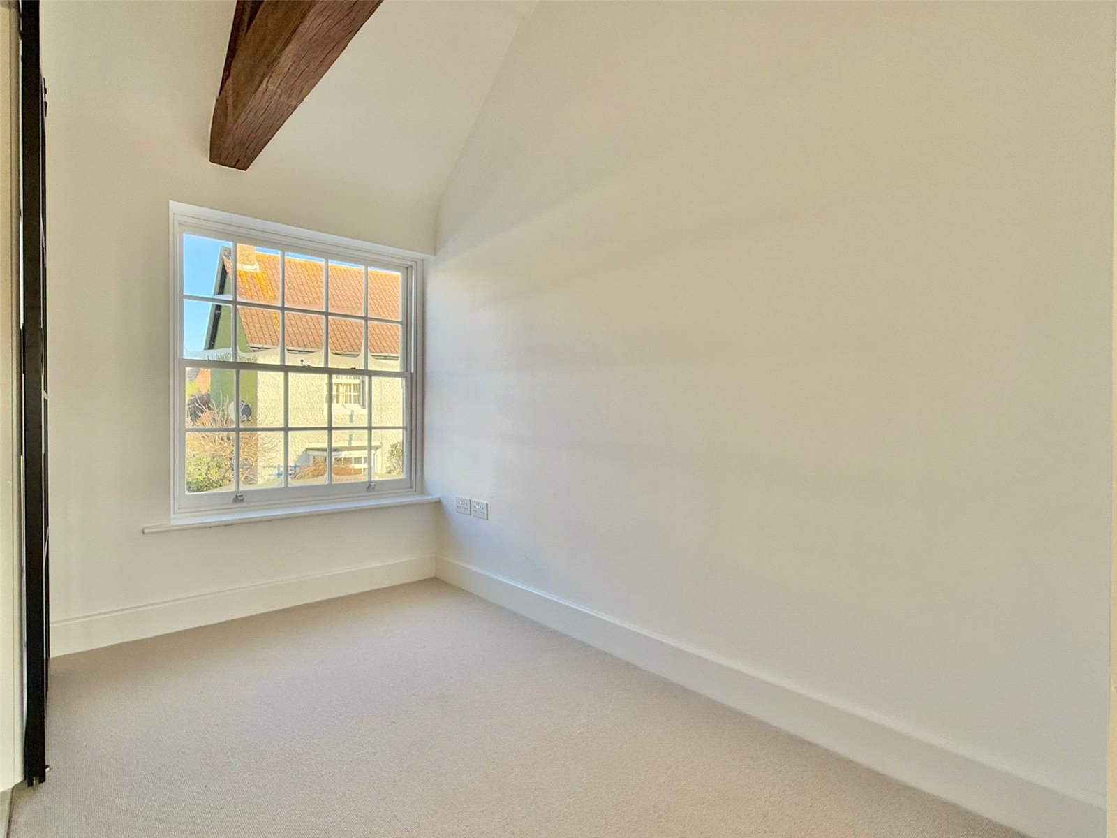 BEDROOM THREE with high vaulted ceiling and feature oak beams, sash window overlooking the front aspect, and recessed ceiling spotlighting