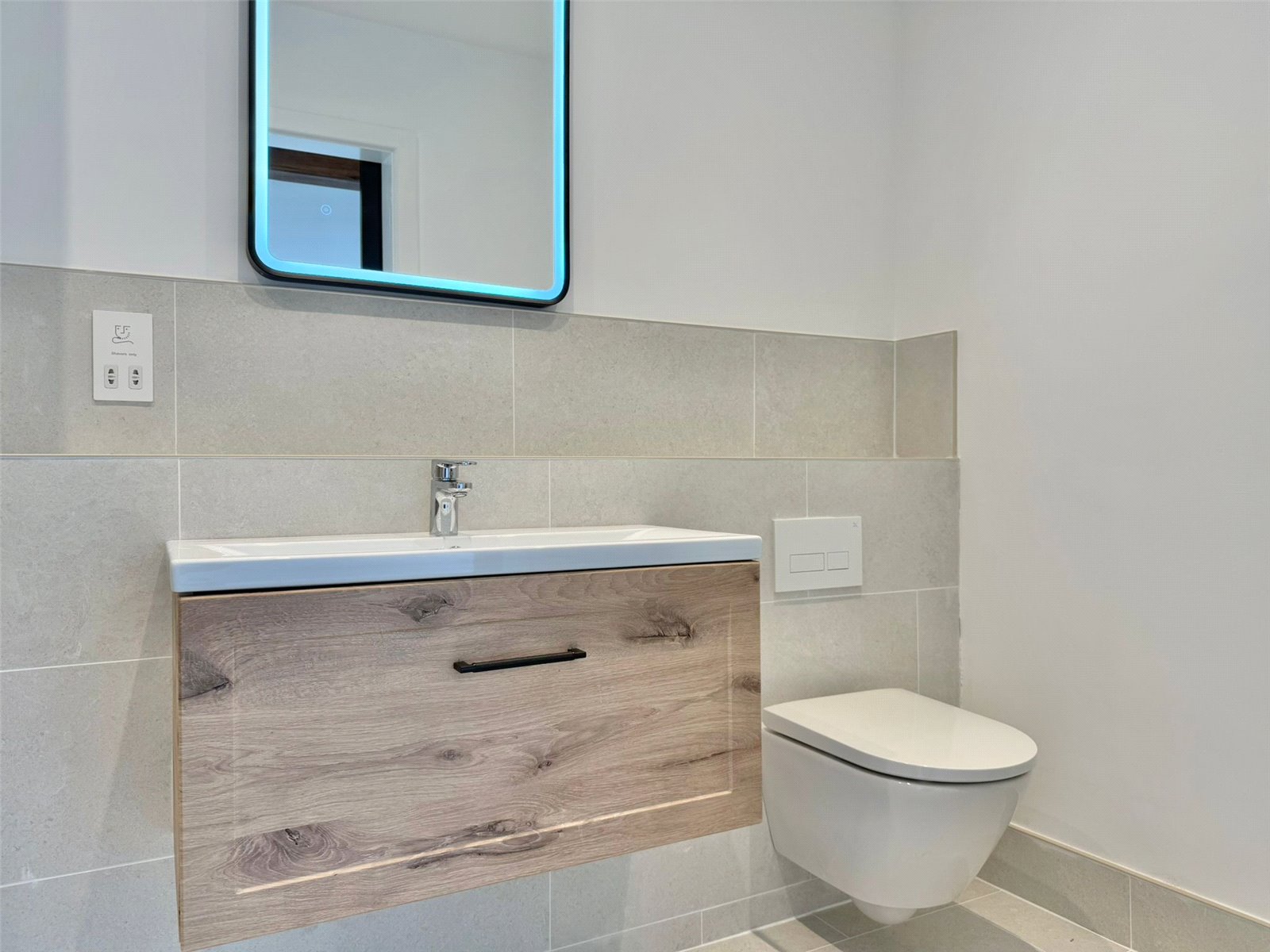 GROUND FLOOR WC with contemporary wall hung DURAVIT wc, vanity wash hand basin, recessed ceiling spotlighting, tiled flooring with underfloor heating
