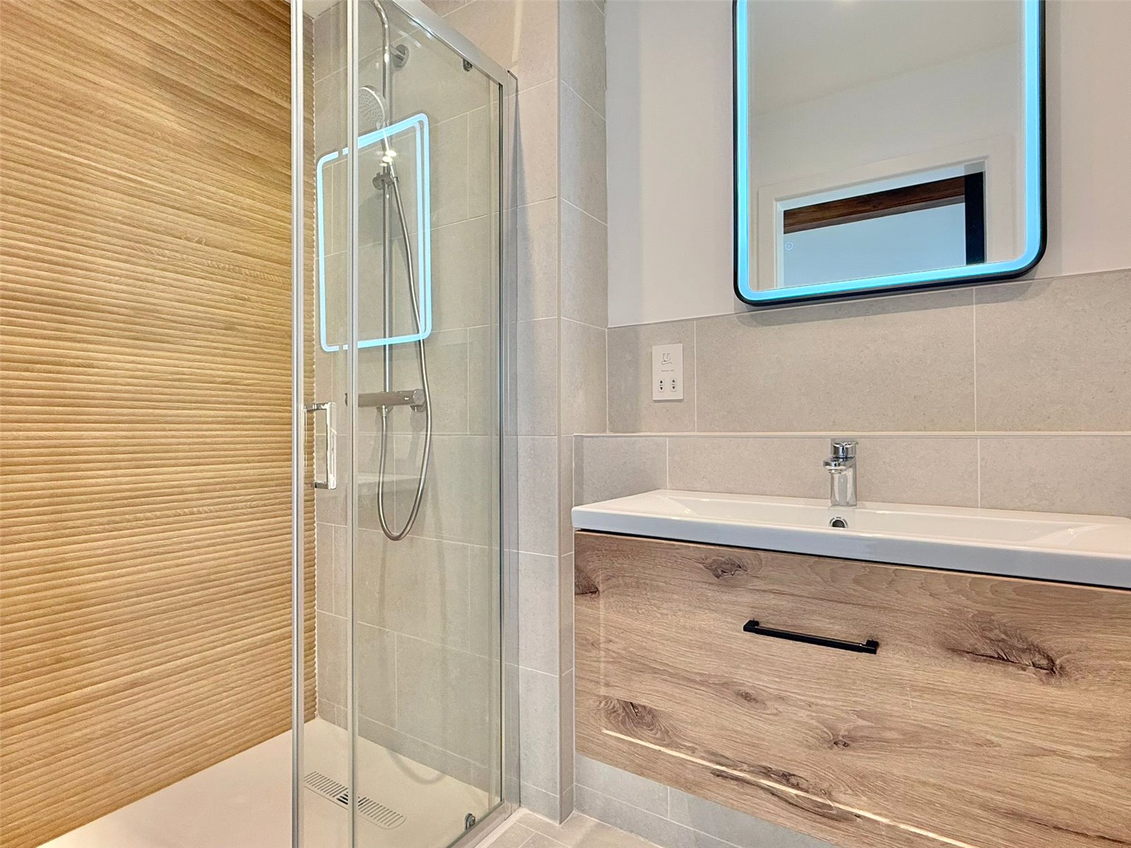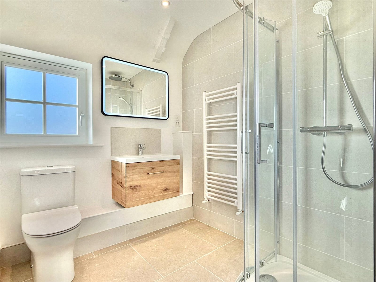 ENSUITE with a large Merlyn shower cubicle with Hansgrohe shower, contemporary DURAVIT wall hung wc with soft close seat, vanity wash hand basin with Hansgroe tap, heated towel rail, shaver point, tiled floor and walls with underfloor heating, feature oak beams with up lighting, recessed ceiling spotlighting, extractor and back-lit mirror