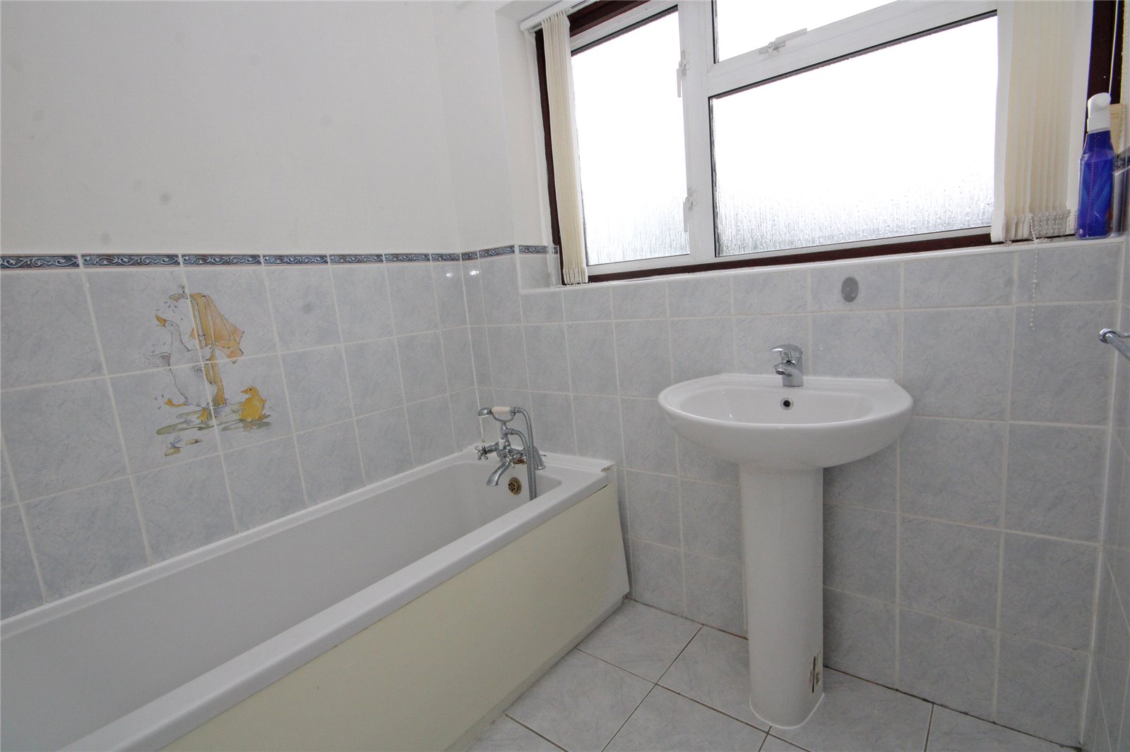 Comprising panelled bath with mixer taps and shower attachment, pedestal wash hand basin, part tiled walls, tiled flooring, obscure double glazed window to rear aspect.