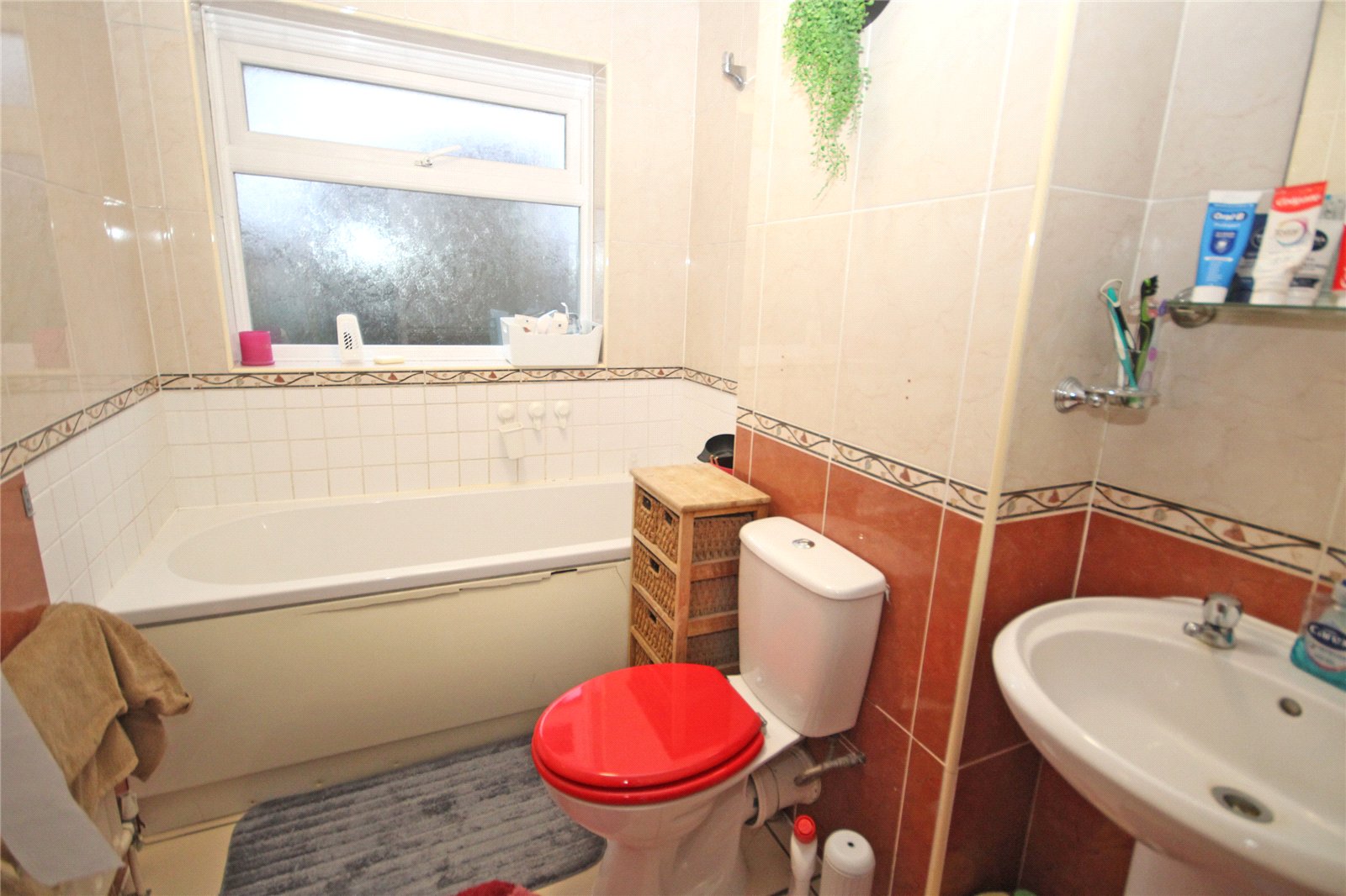 Comprising panelled bath with mixer tap and shower attachment, low level dual flush w.c., pedestal wash hand basin, tiled walls, tiled flooring, obscure double glazed window to rear aspect.