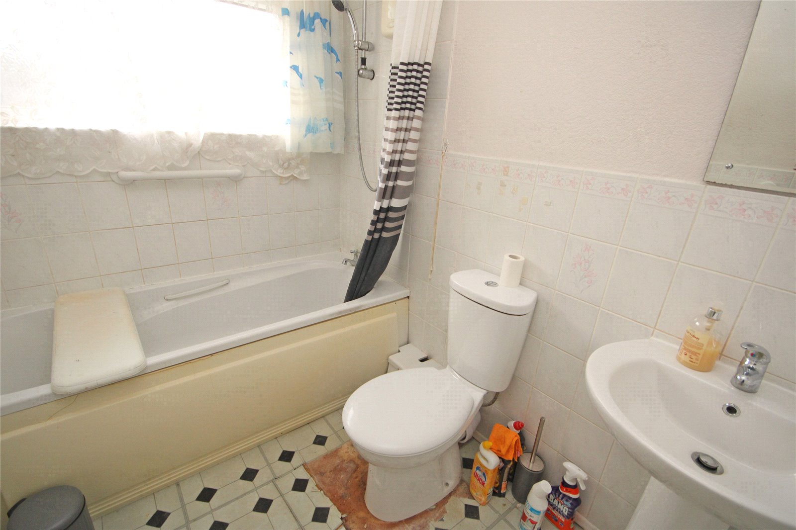 Being part tiled comprising pedestal wash hand basin, low level w.c., bath with Triton shower over, window to rear.