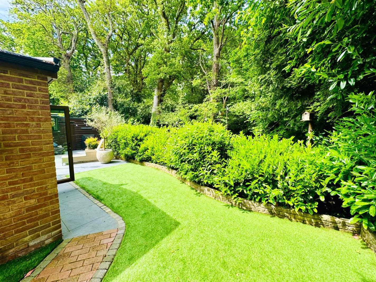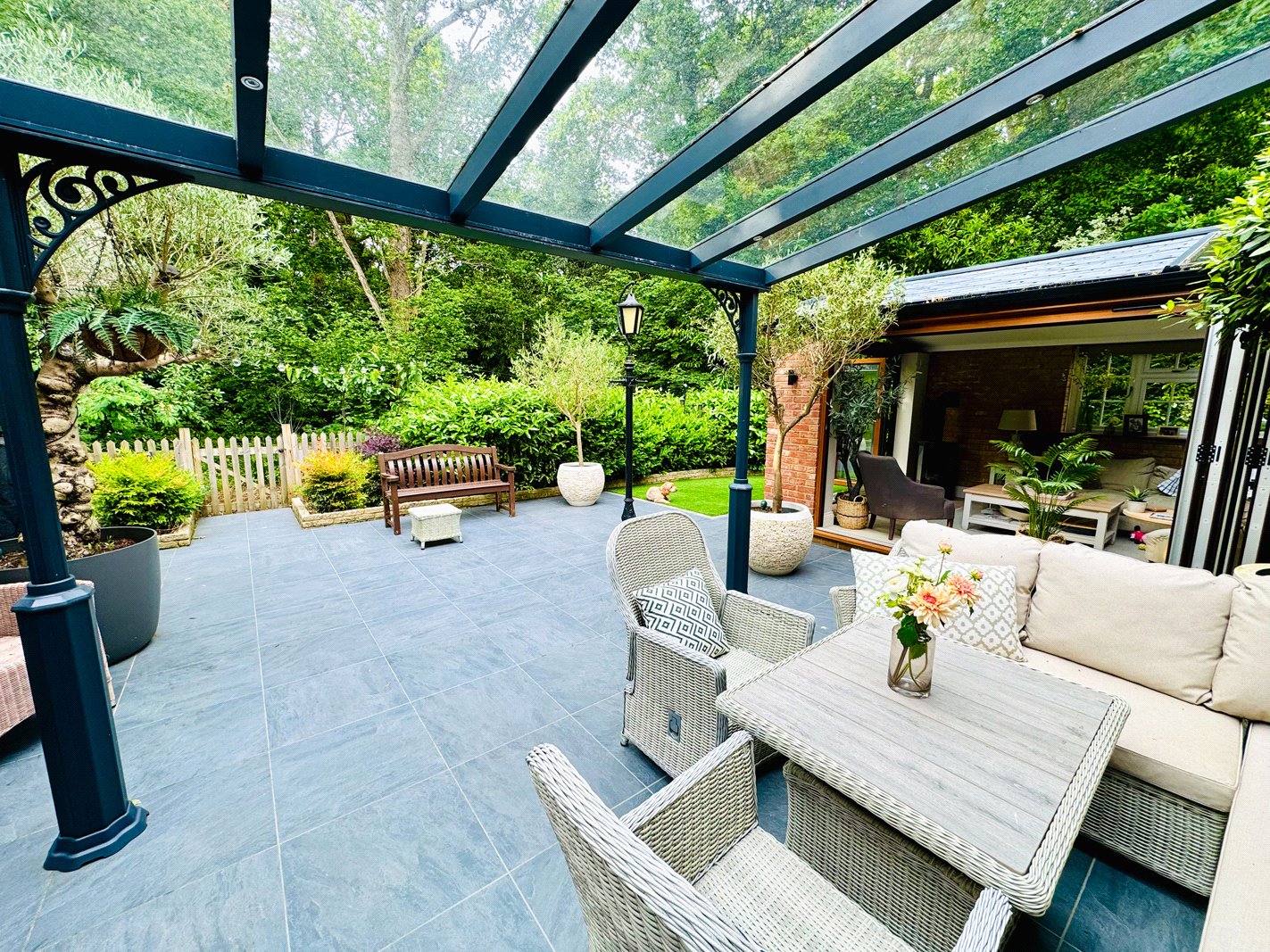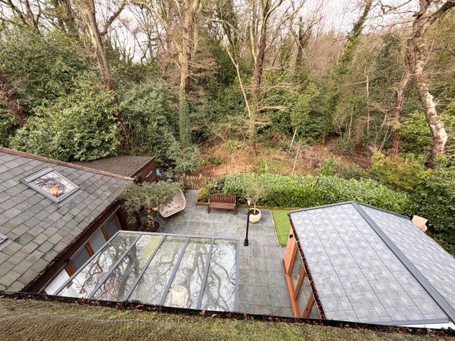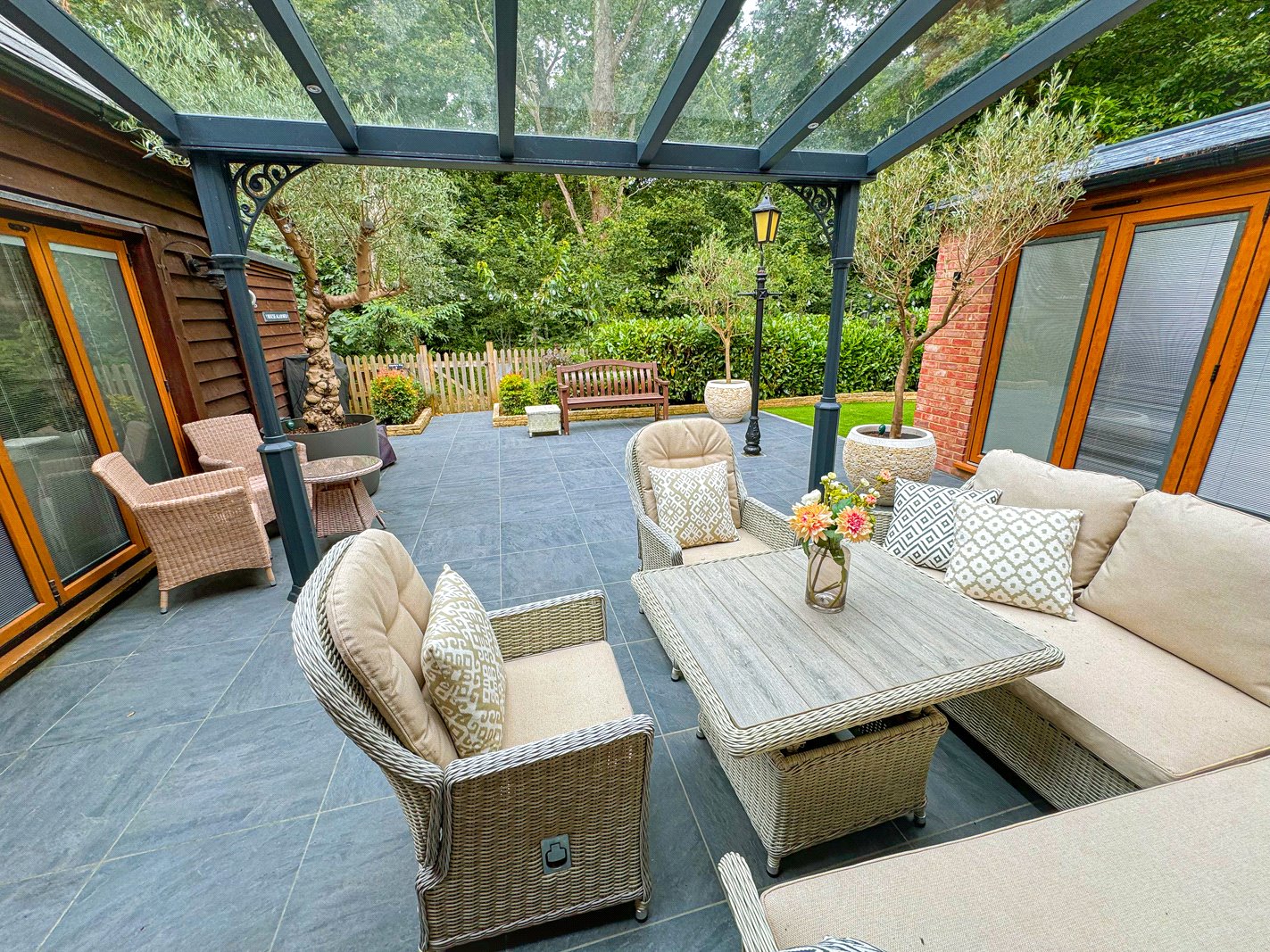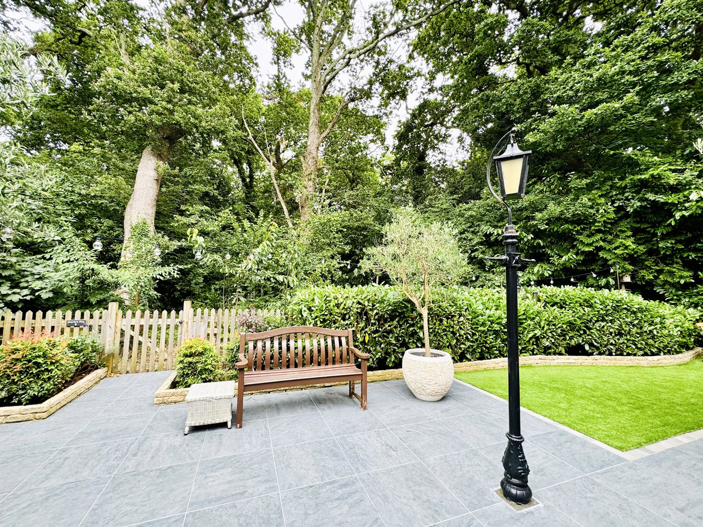 The rear garden has been superbly landscaped and is laid mainly to a large area of attractive porcelain paving with a further area of artificial lawn, large covered dining area, well stocked and maintained borders, a block paviour pathway provides side access, a beautiful and private wooded backdrop, a large timber garden shed with power and light and a fully fitted garage/gym with electrically operated roller door and personal door to the rear garden.