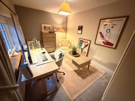 Fully fitted home office with desk, shelving and storage and a lovely outlook over the garden.
