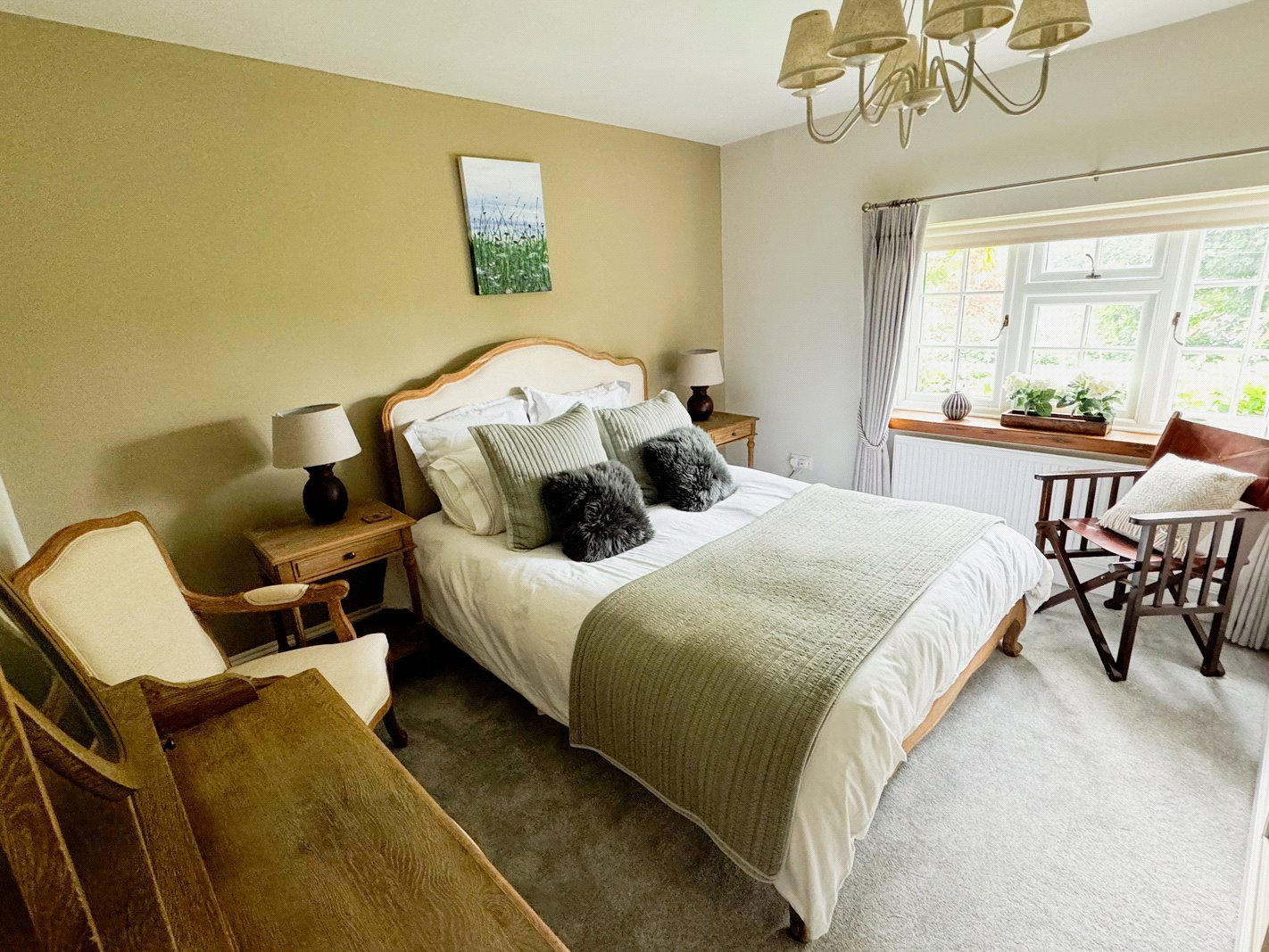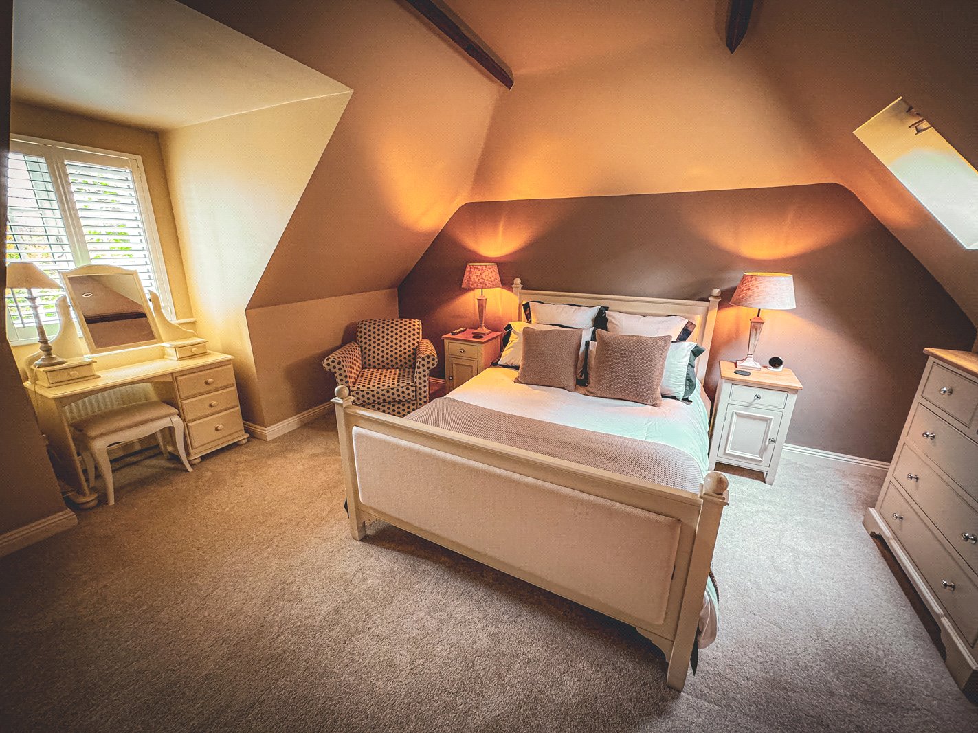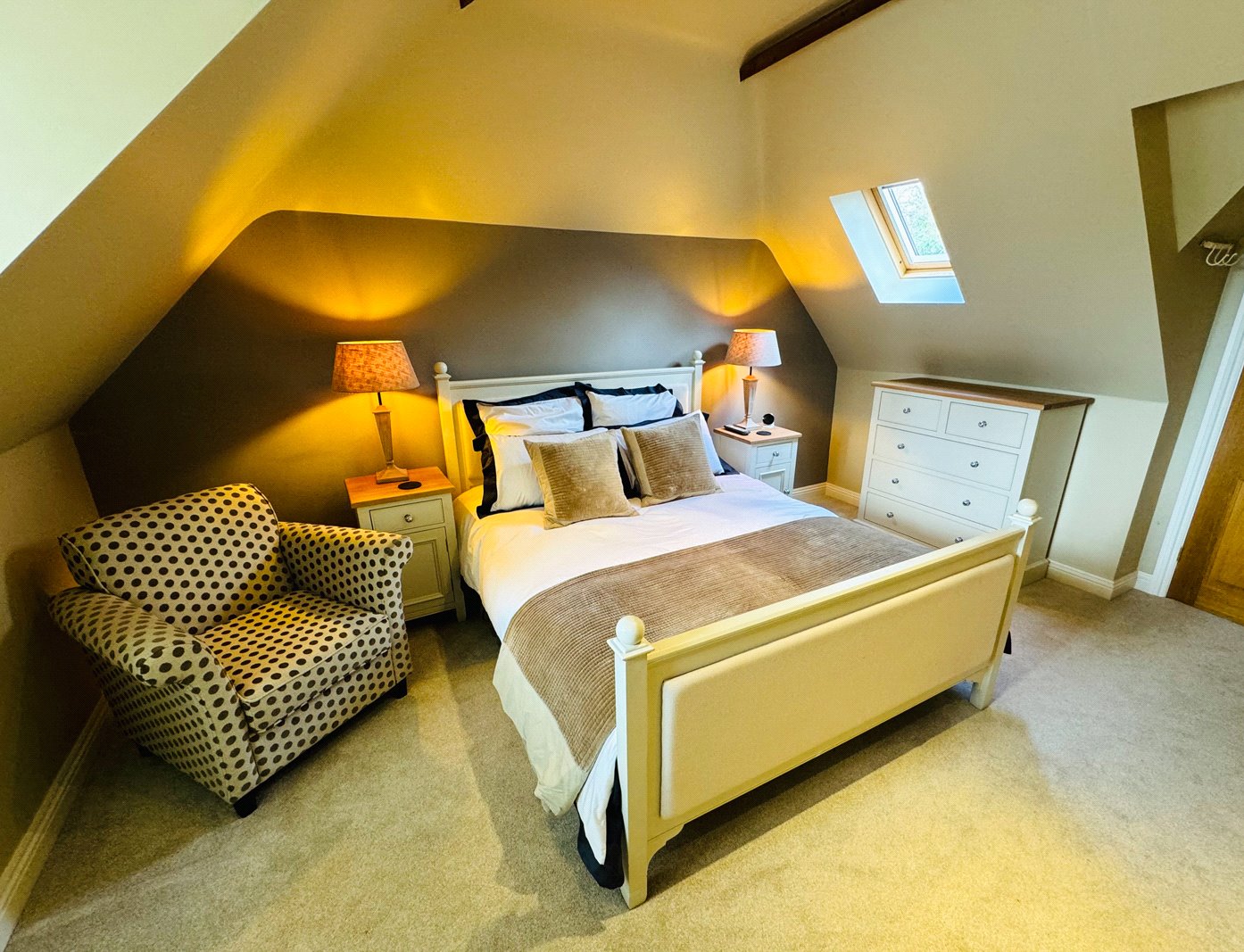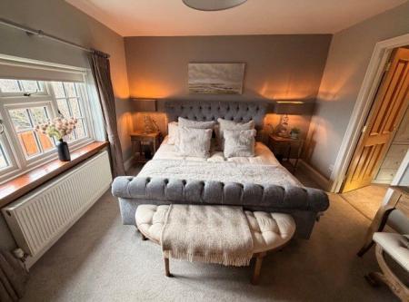 On the first floor is a spacious king sized bedroom Velux window, vaulted ceiling with recess ceiling spotlights, UPVC window giving an attractive outlook to the front, a good range of built in storage, wall mounted TV point and its own luxury en-suite shower room.