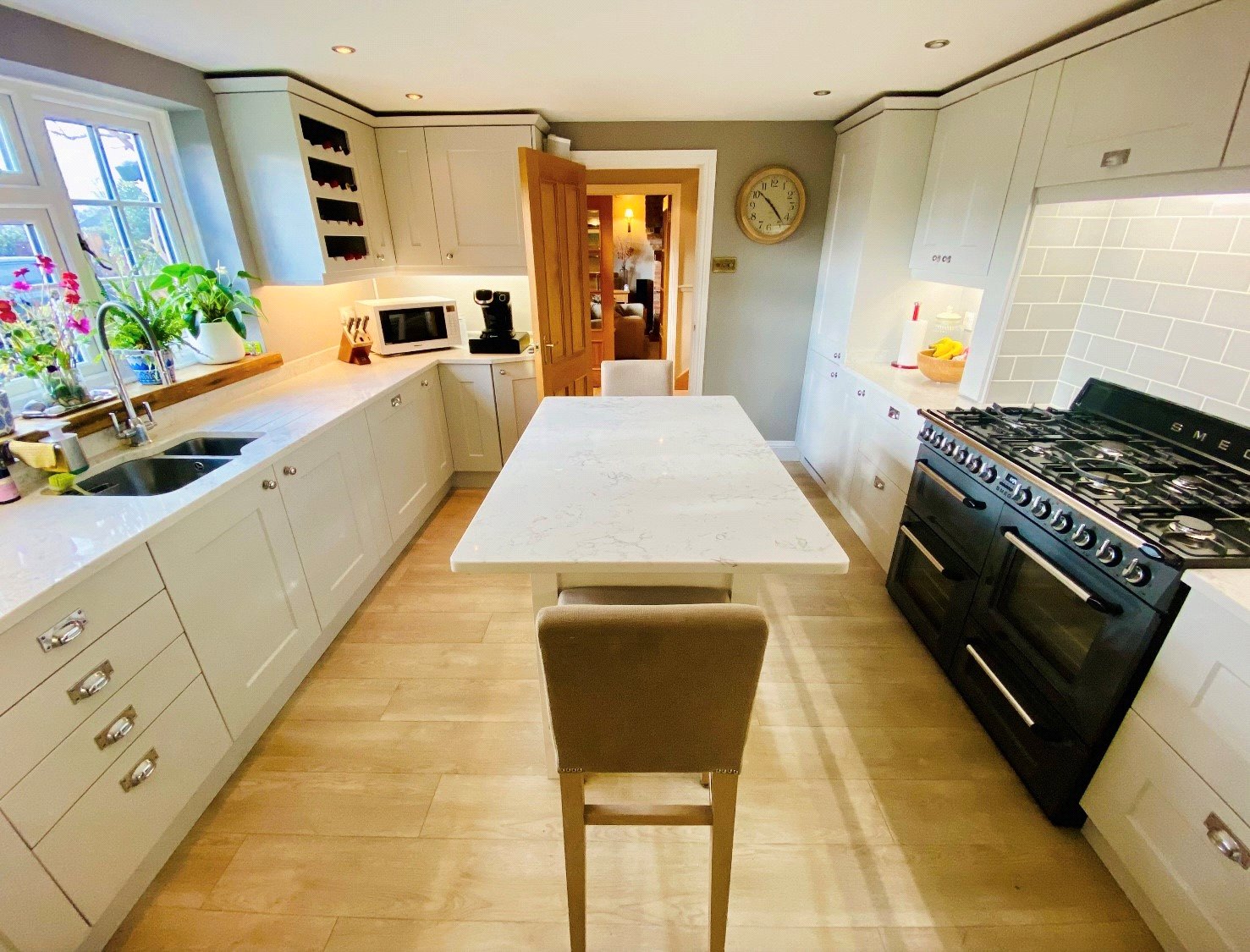 Modern kitchen/breakfast room fitted with a range of light grey wall and base units with marble worktops and upstands and an under-mounted one and a half bowl sink unit with mixer tap over, Smeg range style cooker, integrated fridge and dishwasher, ample room for central breakfast table, a lovely outlook over the front garden and timber effect flooring.