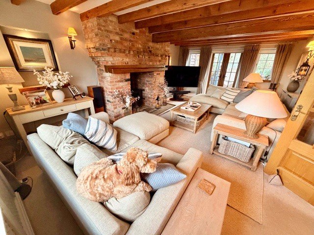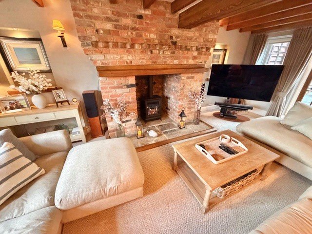 Sitting room benefitting from a double aspect with exposed timber beams, a stunning brick fireplace with timber mantle and stone hearth and recess new Gazco gas stove and twin UPVC double glazed casement doors onto patio and rear garden.