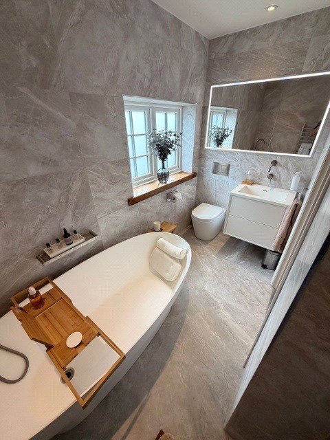Family bathroom with Porcelanosa wall and floor tiling, free standing bath with mixer tap and shower attachment over, separate shower cubicle, wash basin with storage beneath, WC, ladder style heated towel rail, recess ceiling spotlights, built in storage and extractor fan.