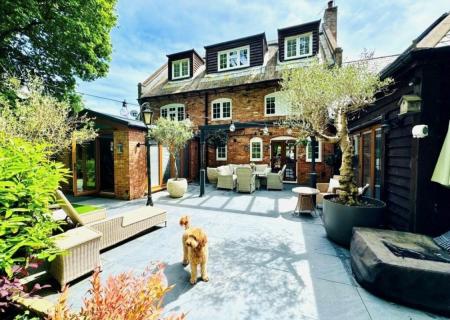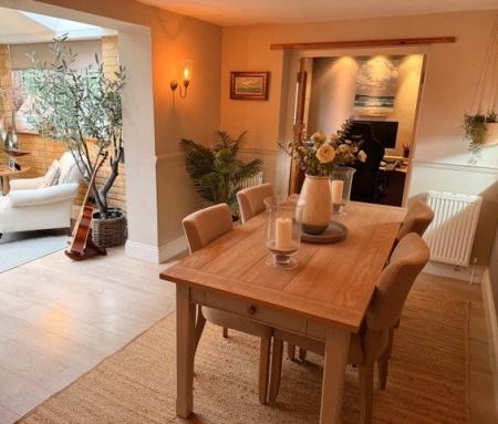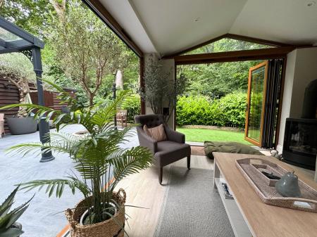 Separate dining room with attractive timber effect flooring and a wide arch leading through to the stunning triple aspect garden room which has twin roof lights providing an abundance of natural light with corner new Gazco gas stove, two sets of bi-fold doors onto the patio and rear garden and a beautiful outlook over the gardens to the wooded backdrop.