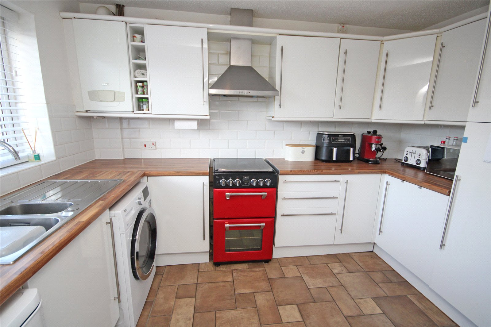 Being part tiled comprising bowl and a third single drainer sink unit with mixer taps, range of work surfaces with drawers and cupboards below, space for gas cooker with extractor hood over, matching wall mounted units, space and plumbing for washing machine and dishwasher, tiled flooring, further space for up-right fridge/freezer, wall mounted Baxi gas fired central heating boiler, window to front.