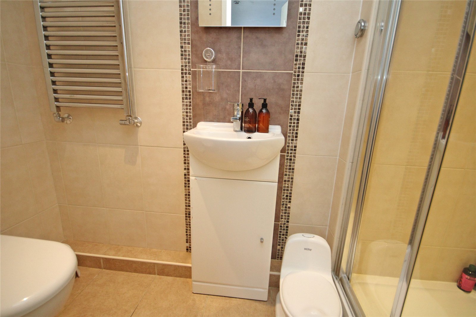 Being fully tiled comprising wash hand basin with mixer tap, low level w.c., tiled shower cubicle with shower over, tiled flooring, heated towel rail.
