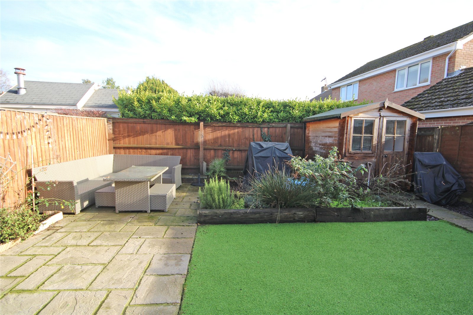 with paved pathway and good sized paved patio area, artificial lawn, bordered by fencing with raised shrub border.
