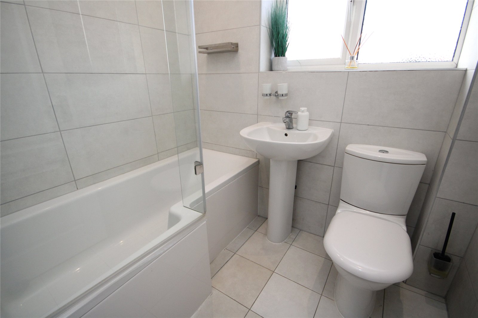 Being fully tiled comprising pedestal wash hand basin with mixer tap, low level w.c.,. bath with mixer tap and shower over with further hand held attachment, heated towel rail, tiled flooring, window to front.