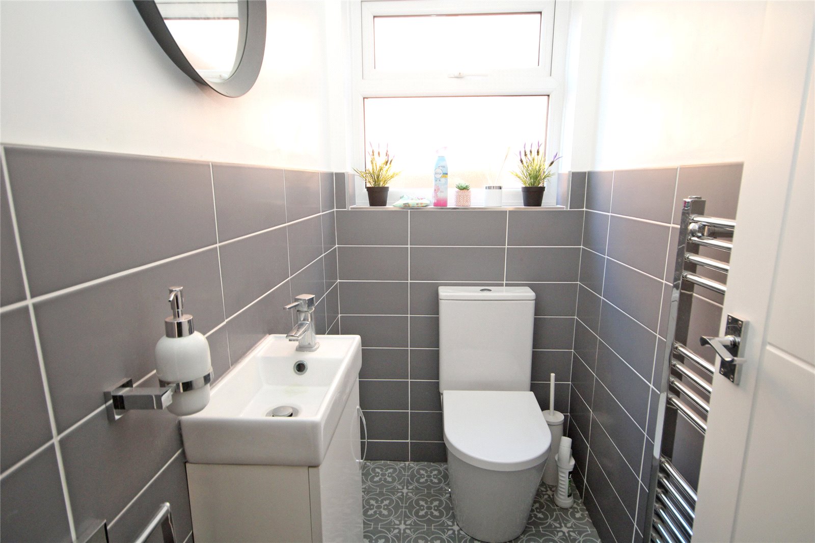 Comprising low level dual flush w.c., wash hand basin with cupboard below, heated towel rail, part tiled walls, obscure double glazed window to side aspect. Door leading to: