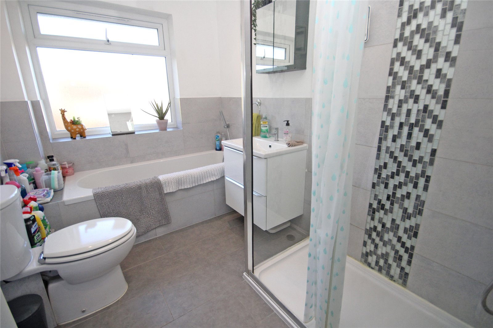 Comprising panelled bath with mixer tap and shower attachment over, good sized fully tiled shower cubicle, low level dual flush w.c., wash hand basin with drawers below, heated towel rail, part tiled walls, tiled flooring, extractor fan, obscure double glazed window to rear aspect.