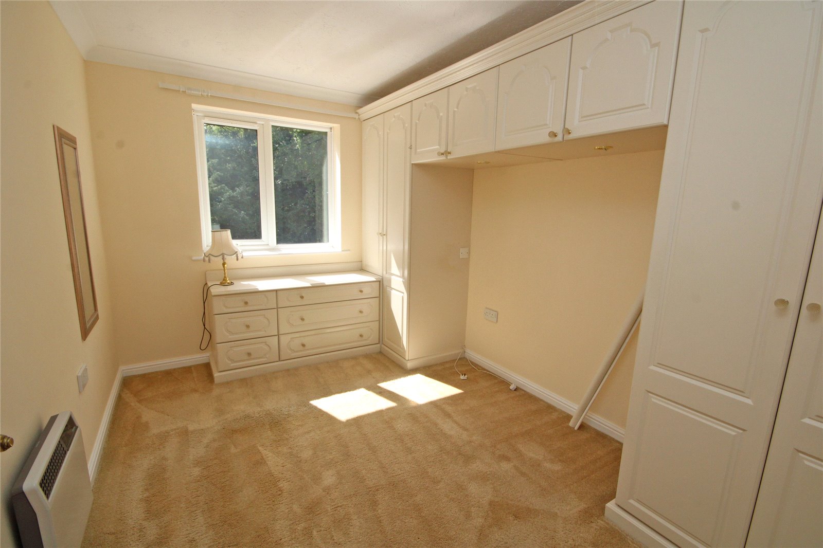 Range of fitted wardrobe cupboards incorporating further drawer units, electric heater, window overlooking rear communal gardens.