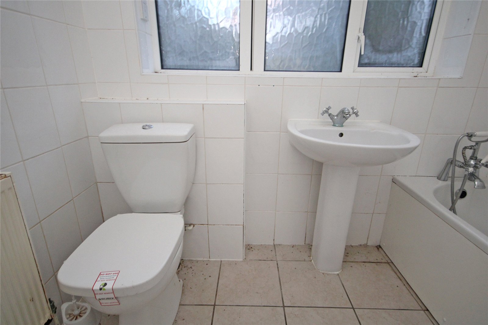 Being part tiled comprising pedestal wash hand basin, low level w.c., bath with mixer taps, window to rear.