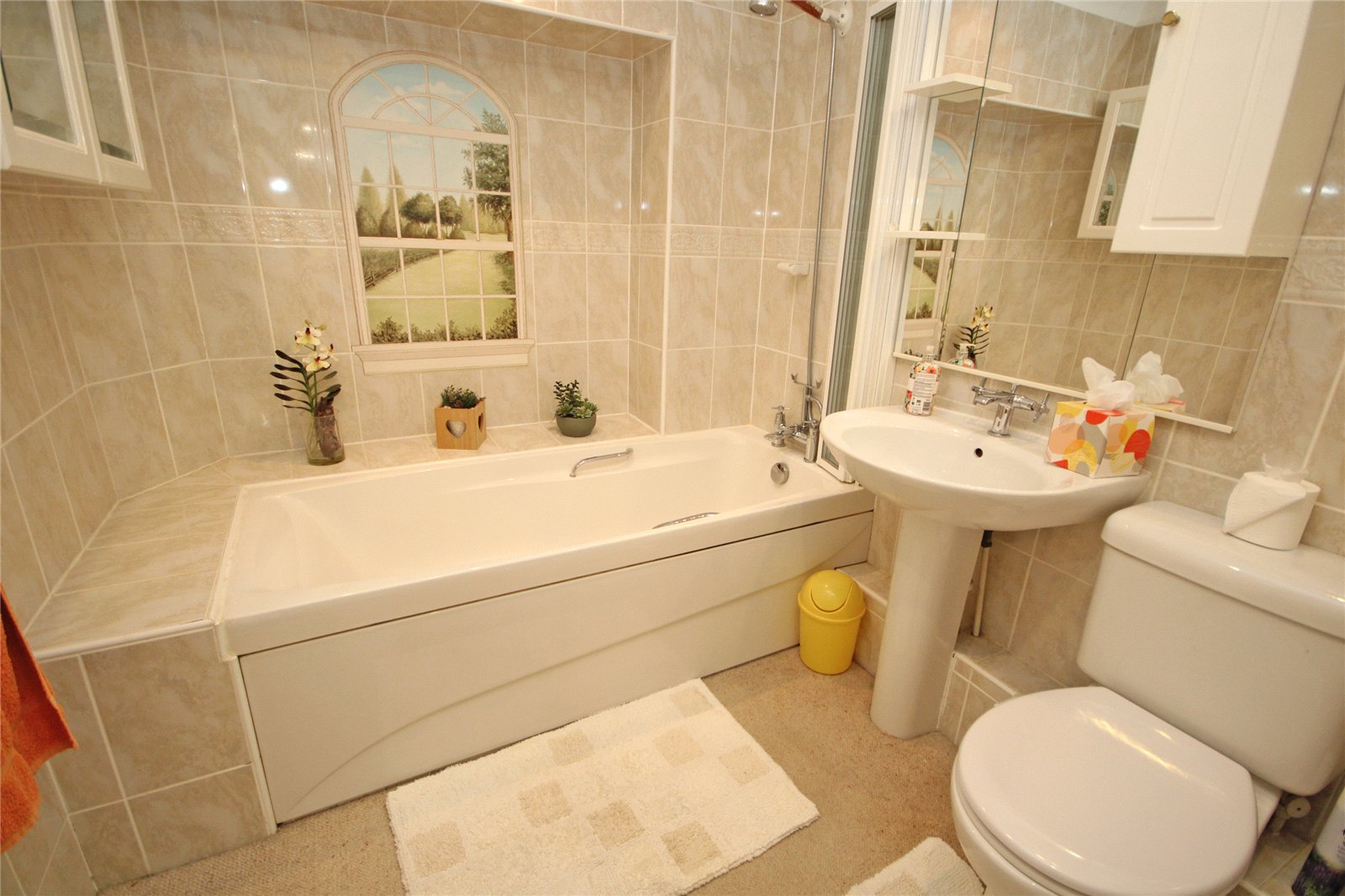 Being fully tiled comprising pedestal wash hand basin with mixer tap, low level w.c., bath with mixer tap and shower over.