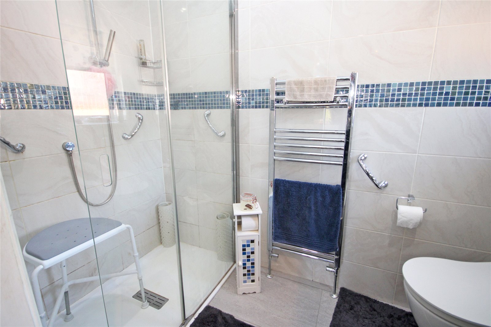 Comprising large fully tiled walk in shower cubicle, wall hung w.c., wash hand basin with cupboards and drawer below, ladder style heated towel rail, fully tiled walls, tiled flooring, inset ceiling downlighters, extractor fan, obscure UPVC double glazed window to side aspect.