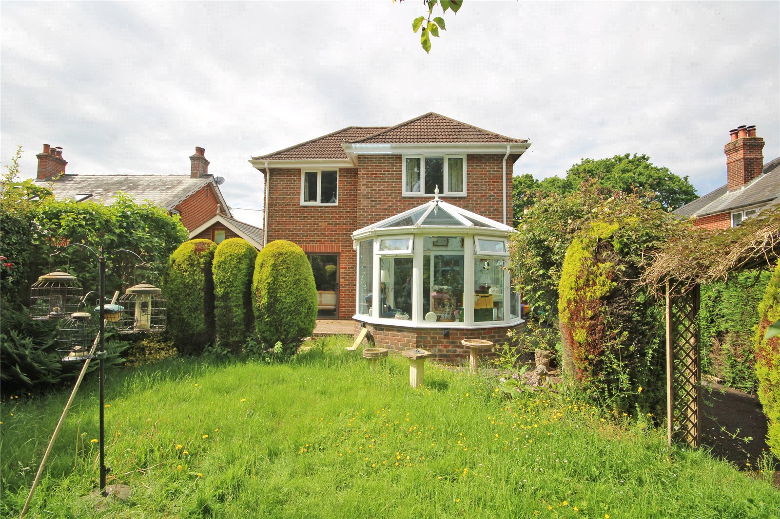 faces in a southerly direction with an area of decking immediately abutting the conservatory and dining room, outside lighting, leading to a further area of patio with shaped level lawn with mature hedging and shrubs, benefiting from a good degree of privacy, enclosed by fencing and hedging. To the side of the garage there is a further area of parking, in turn leading to pedestrian access gate leading to woodland behind, providing a delightful rural aspect.