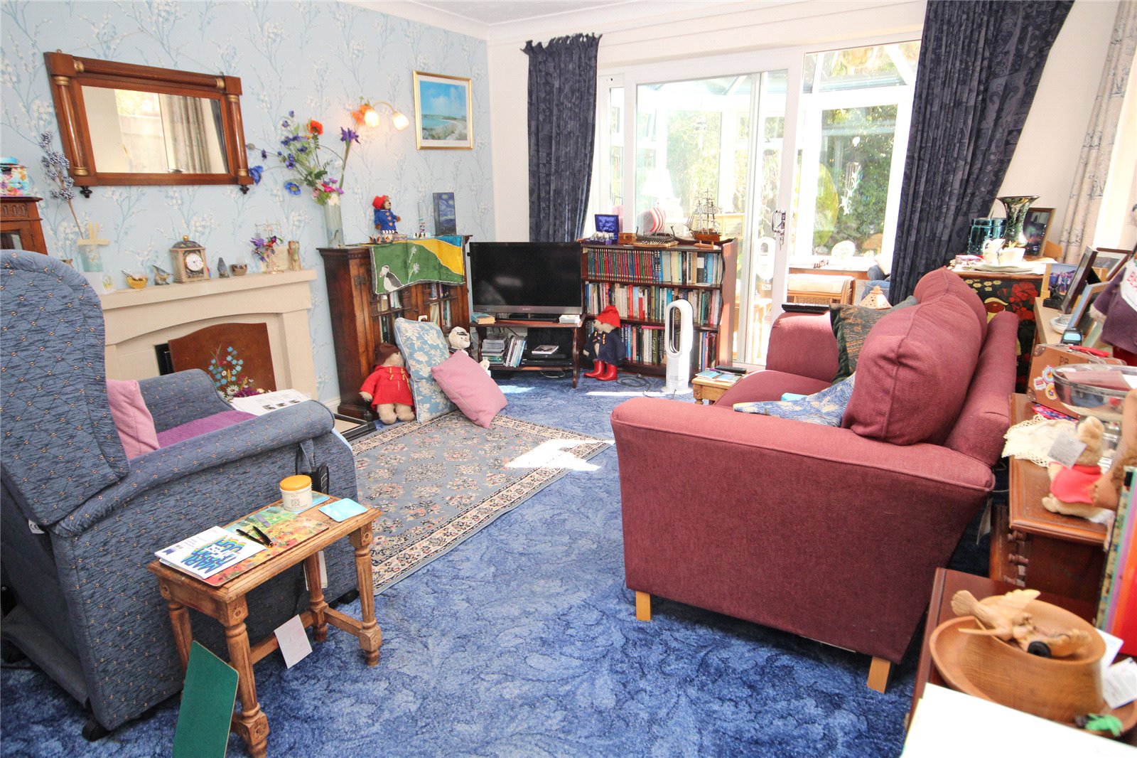 A bright double aspect room with UPVC double glazed sliding patio door to rear aspect, further UPVC double glazed windows to side, radiator, ceiling light point, fitted gas fire with stone surround, mantel and hearth. Leading through to: