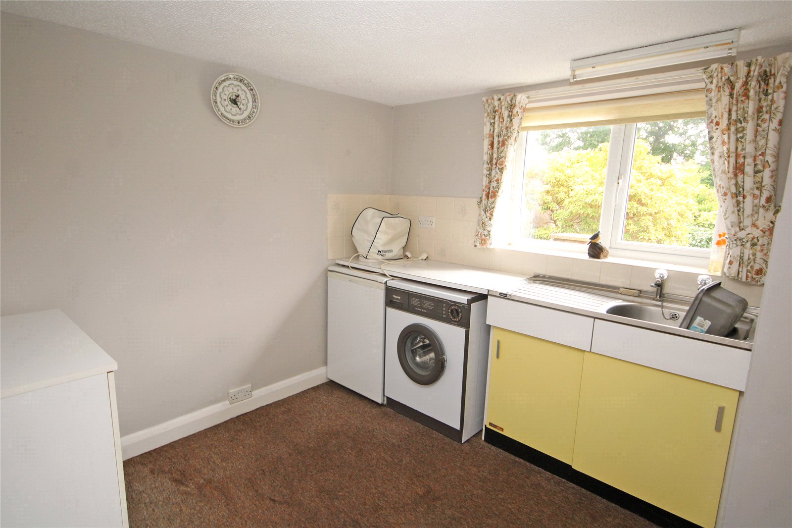 Being part tiled comprising single bowl single drainer sink unit with adjoining work surface, space and plumbing for washing machine, window and door to rear garden. Further door to front and personal door to garage.