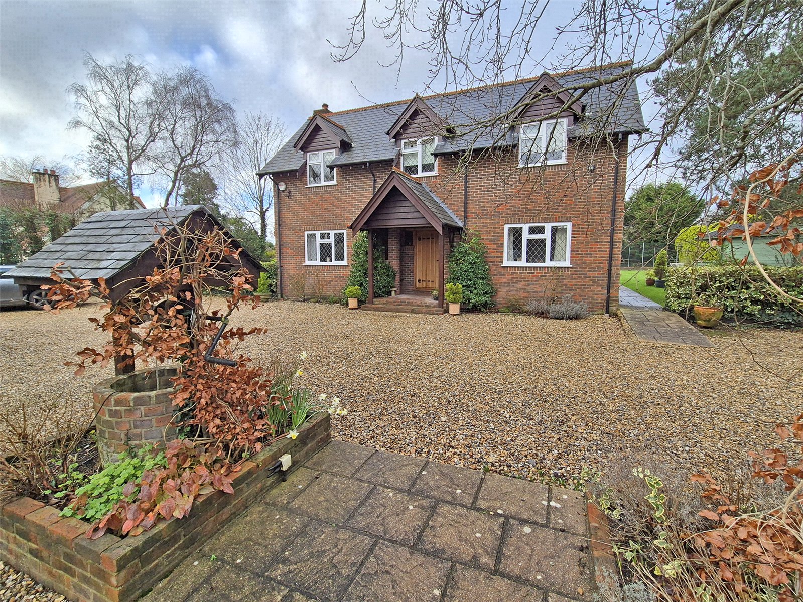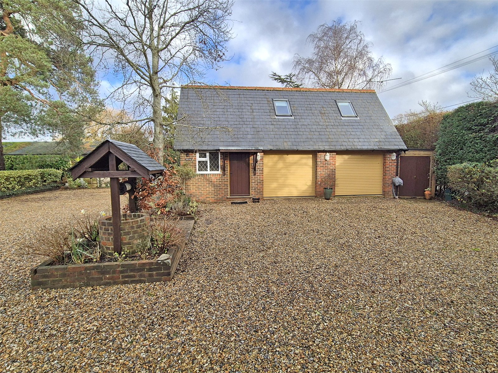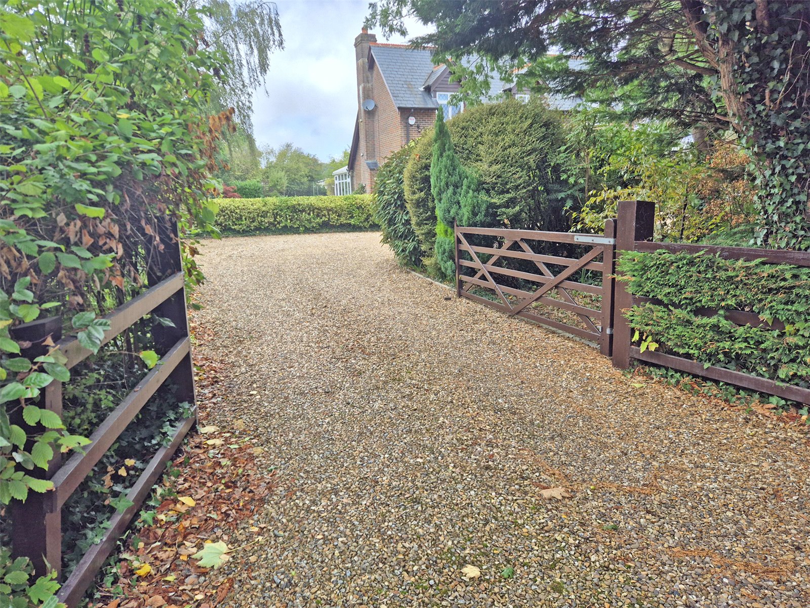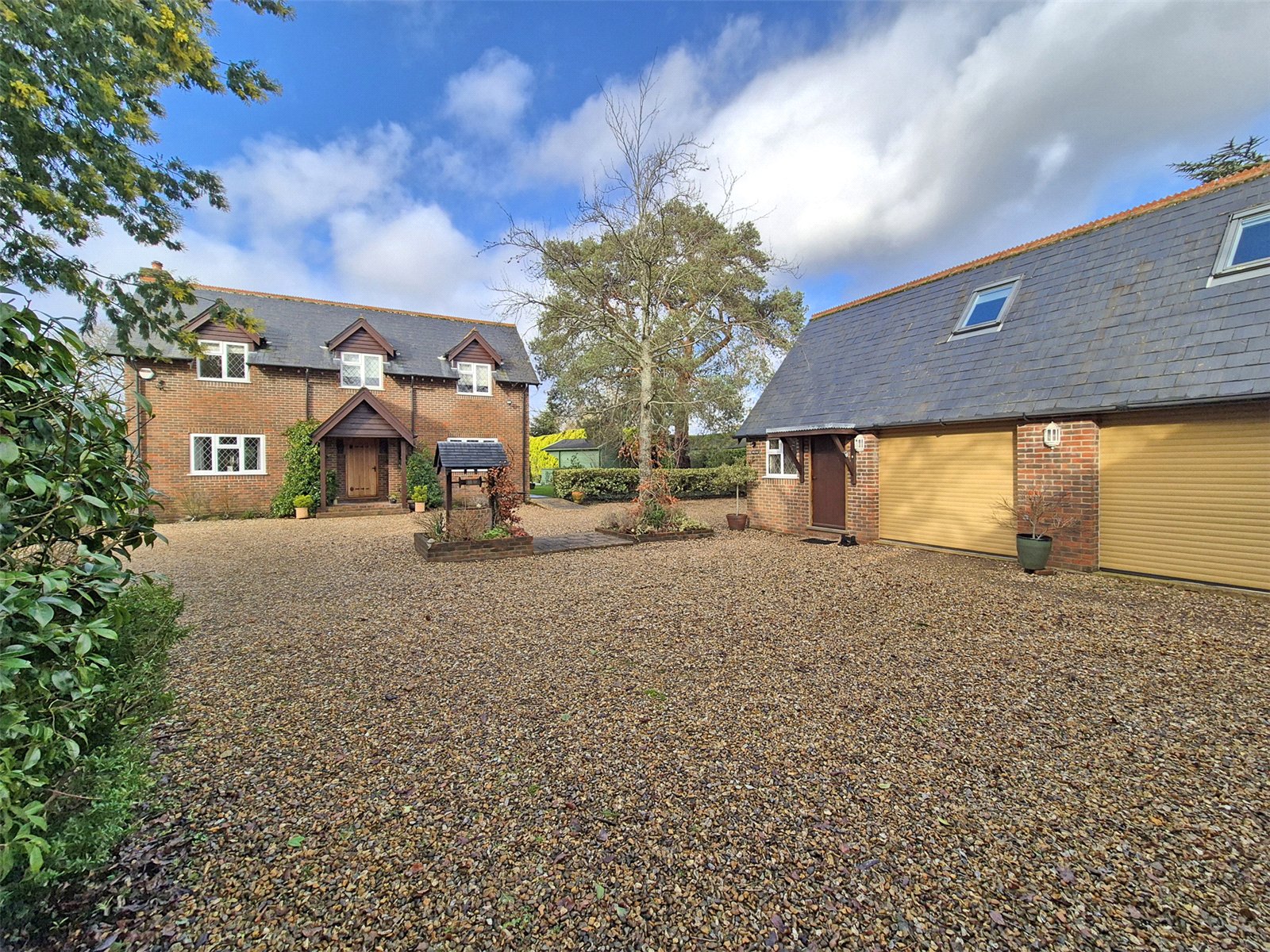 The property is approached via a five bar gate, leading to a sweeping shingle driveway, providing off road parking for several vehicles with ample space for motorhome/boats. The front garden has been attractively landscaped with mature hedging and shrubs, central well,.