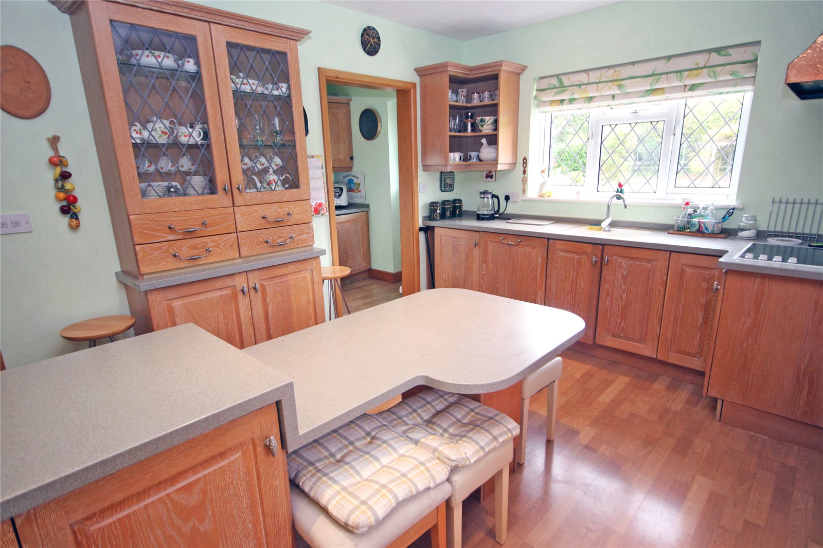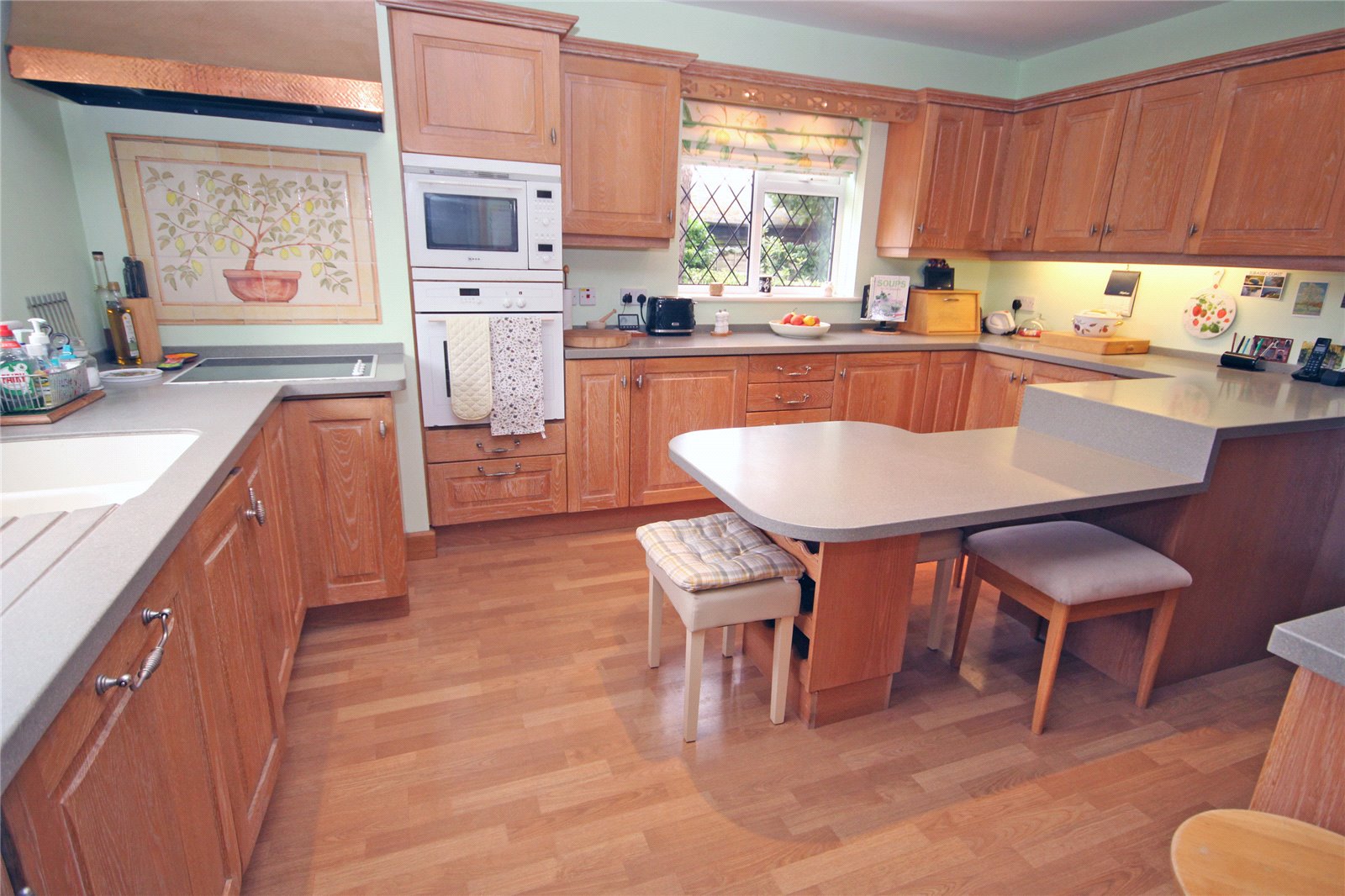 Range of roll edge work surface with inset bowl and a half Butler style sink with drainer to side, breakfast table, inset four ring Neff electric hob with extractor over, further electric oven and microwave to side, integrated fridge and dishwasher, wood effect flooring, range of base cupboards and drawers and further matching wall mounted units, double glazed window to side aspect, further double glazed window to rear. Opening through to: