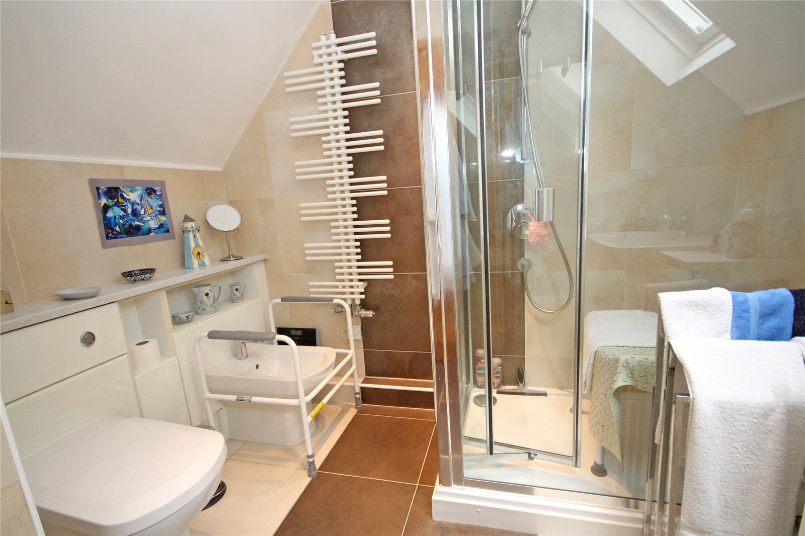 Comprising fully tiled shower cubicle, low level dual flush w.c., bidet, wash hand basin with cupboards below and to side, shaver point over, tiled flooring, tiled walls, ladder style heated towel rail.
