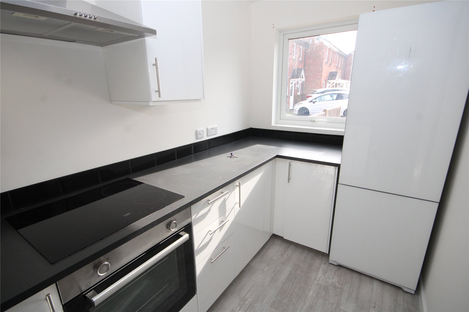 Range of work surface with inset bowl and a third single drainer sink unit, four ring ceramic hob with oven below, extractor over, range of base cupboards and drawers, space and plumbing for washing machine, space for up-right fridge/freezer, further matching wall mounted units, wood effect flooring, double glazed window to front aspect.