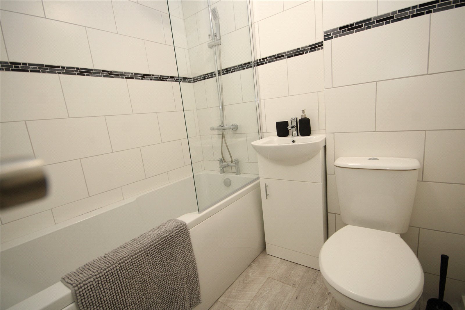 Comprising shaped panelled bath with mixer tap and separate shower unit over, low level dual flush w.c., wash hand basin with cupboard below, tiled walls, ladder style heated towel rail, wood effect flooring, extractor fan.