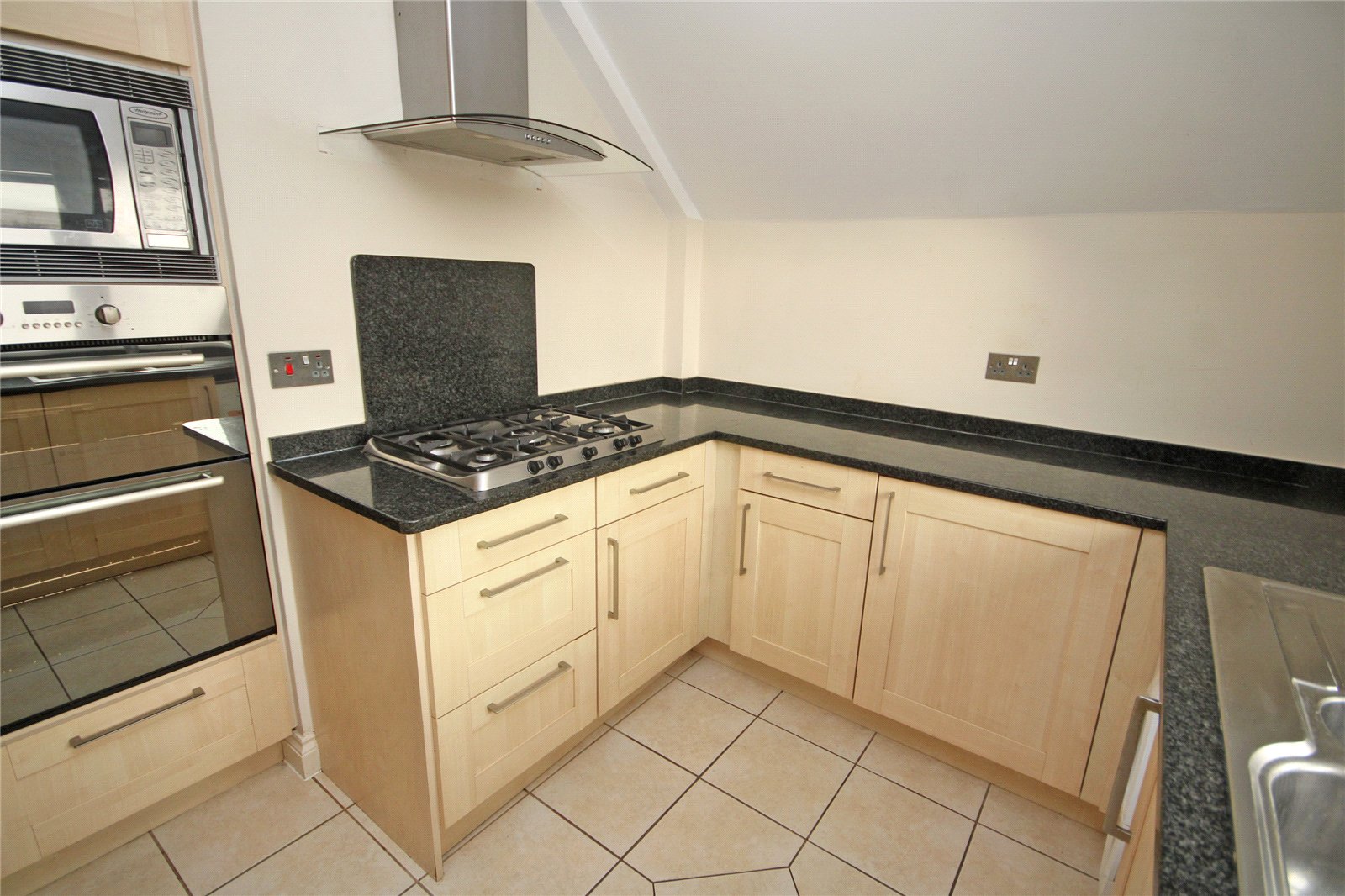 Comprising bowl and a third single drainer sink unit with mixer tap, range of granite work surfaces with abundance of drawers and cupboards below, inset five ring gas hob with extractor hood over, further built in double oven, further microwave, integrated dishwasher and washing machine, further built in fridge/freezer, tiled flooring, window to front.