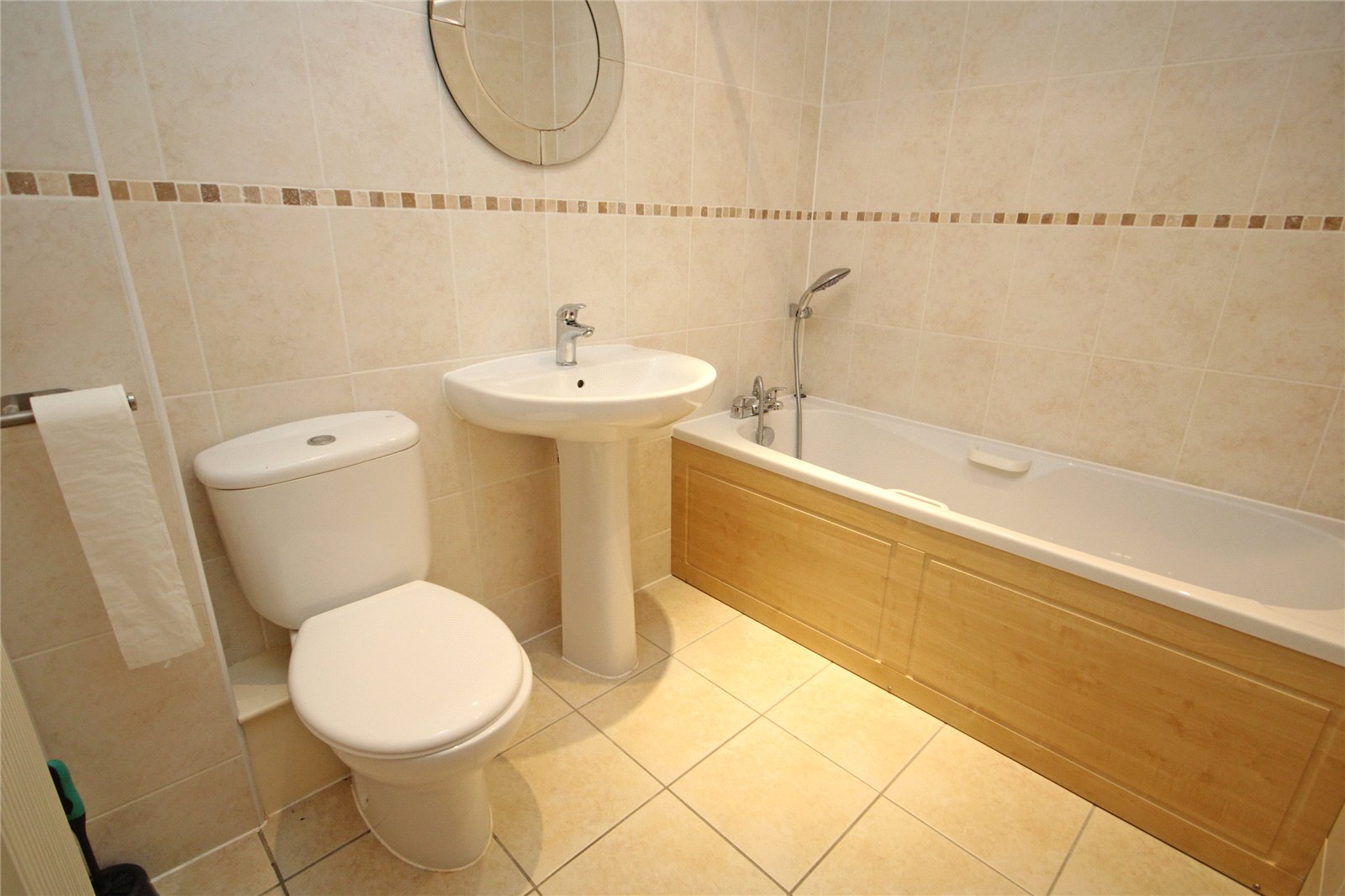 Being fully tiled comprising pedestal wash hand basin with mixer tap, low level w.c., bath with mixer tap and shower attachment, tiled flooring.