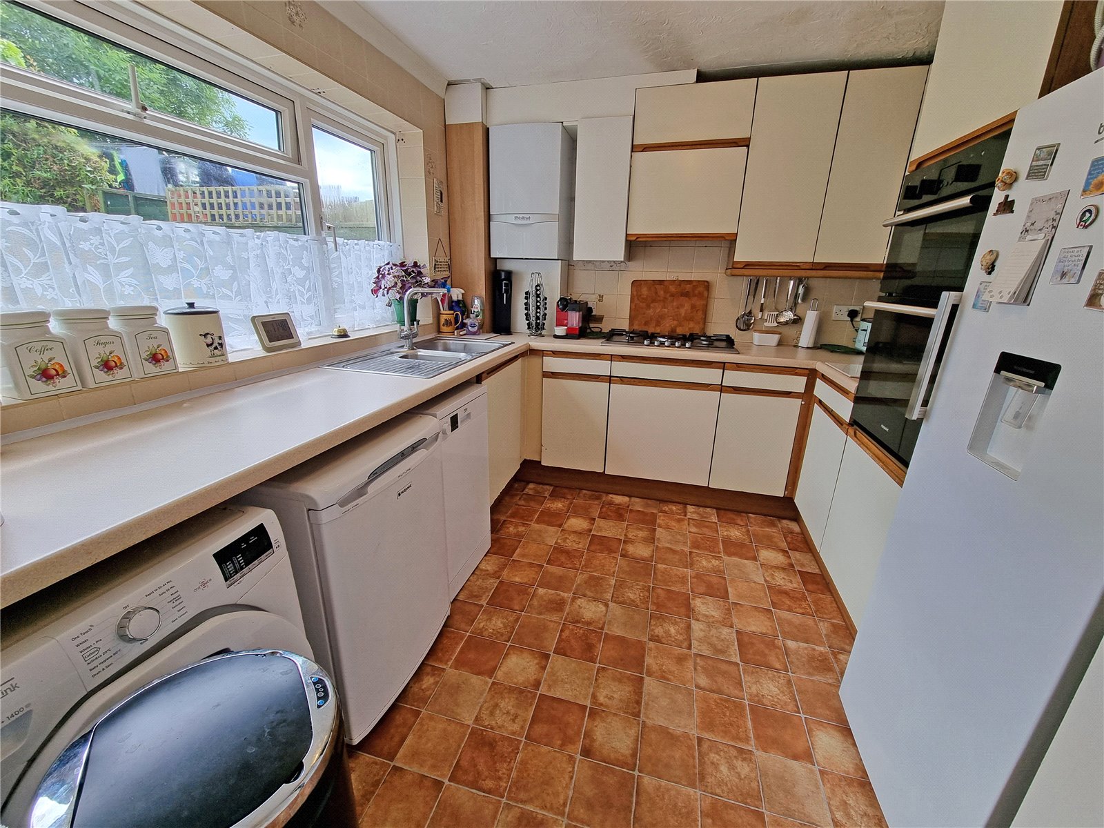 Range of roll edge work surfaces with inset five ring gas hob with extractor over, built in Hotpoint double oven and grill in tall housiing with cupboard above and below, range of base cupboards and drawers, inset bowl and a third single drainer sink unit, space and plumbing for washing machine, space and plumbing for dishwasher, space for up-right fridge/freezer, further matching wall mounted units, wall mounted Vaillant gas fired central heating boiler, ceiling light point, tiled walls, built in storage cupboard, double glazed window overlooking rear aspect.