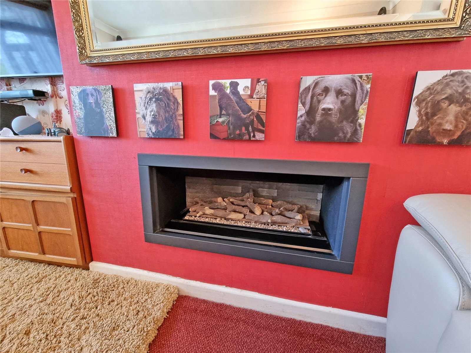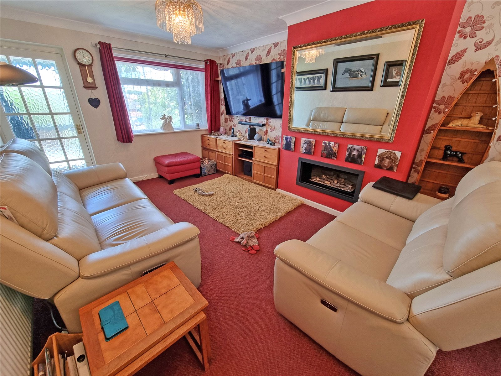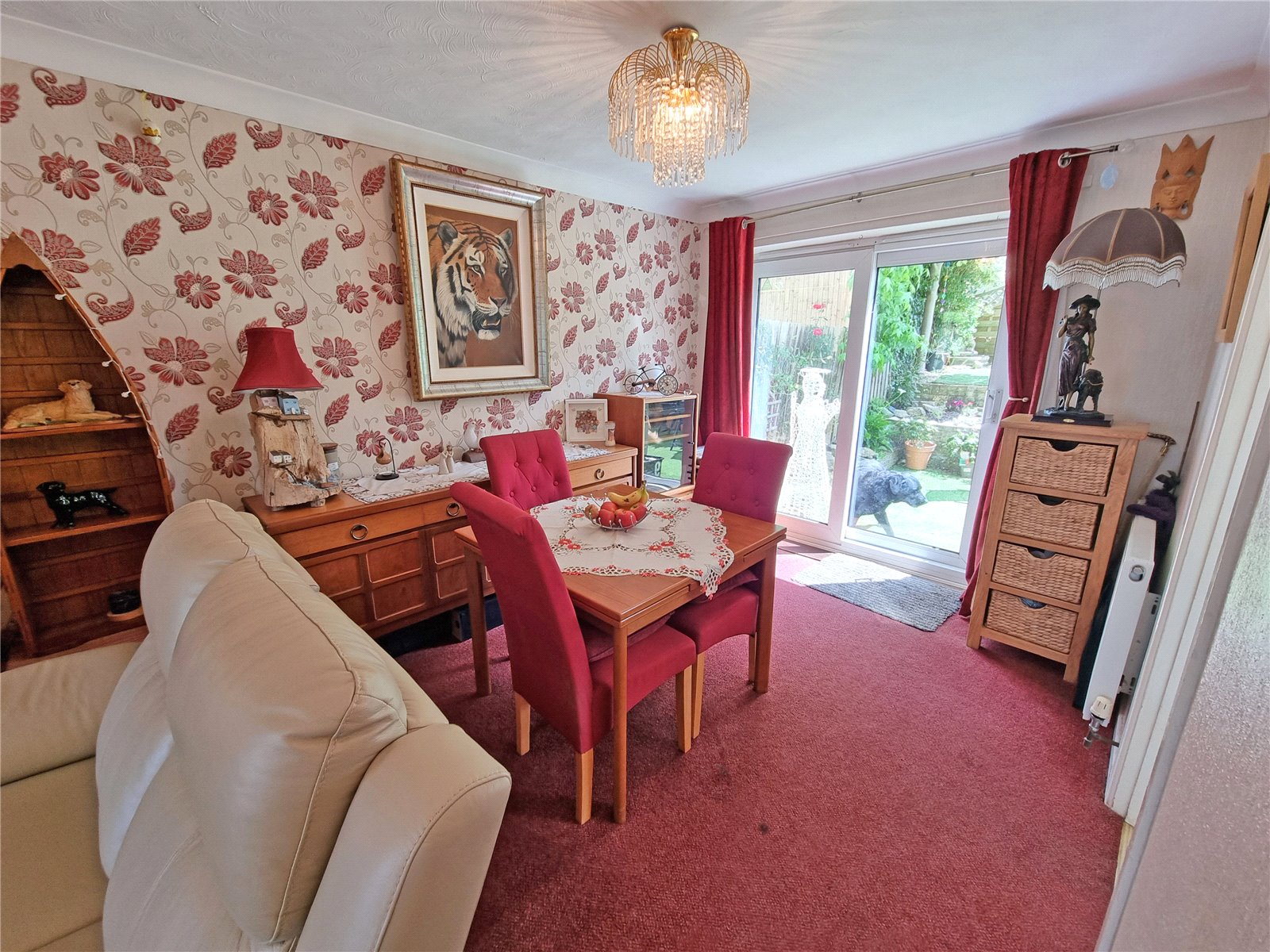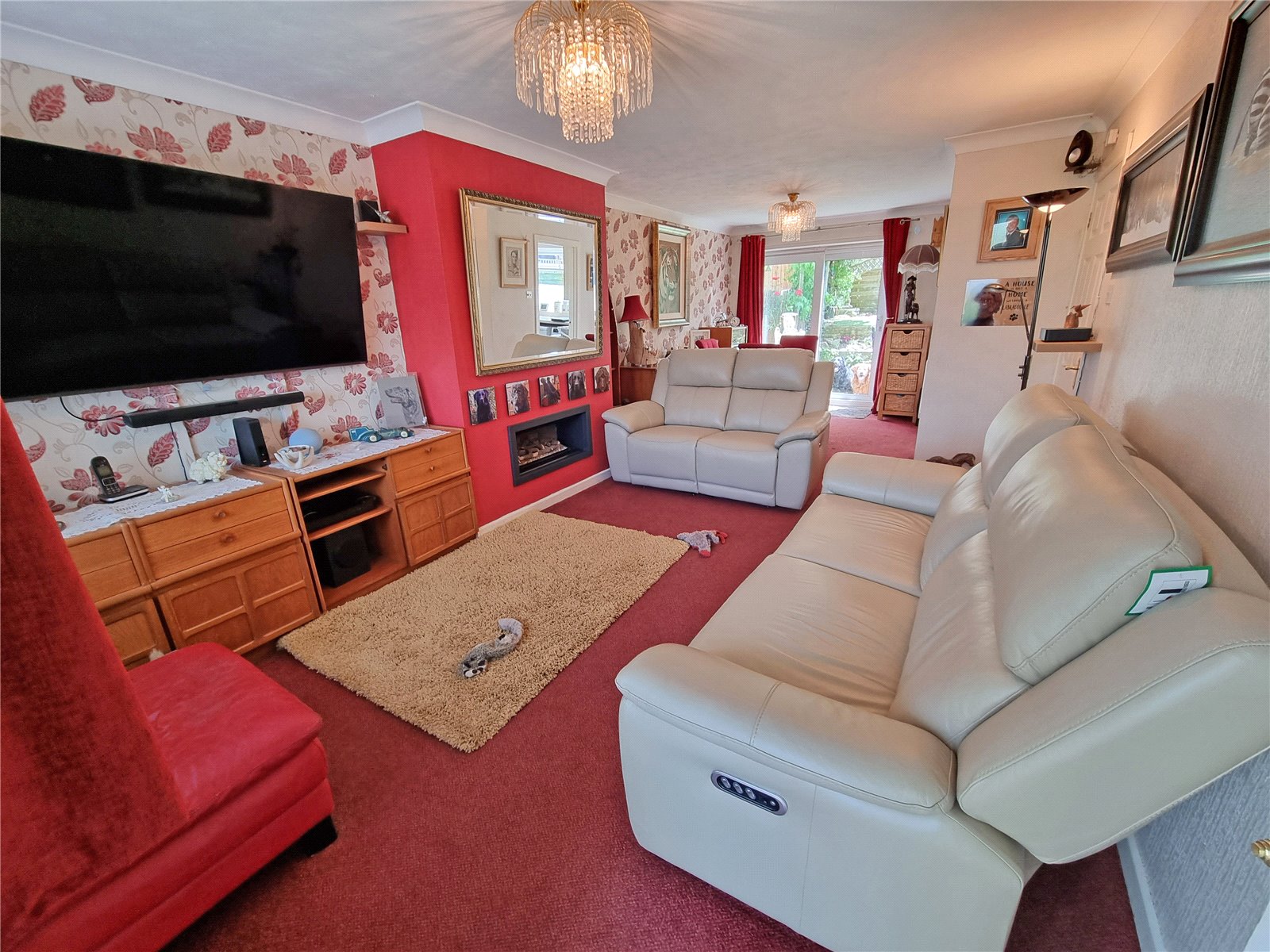 A lovely bright through room with double glazed wiindow to front aspect, further double glazed sliding patio doors to rear, feature fitted gas fireplace, two ceiling light points, door leading to:
