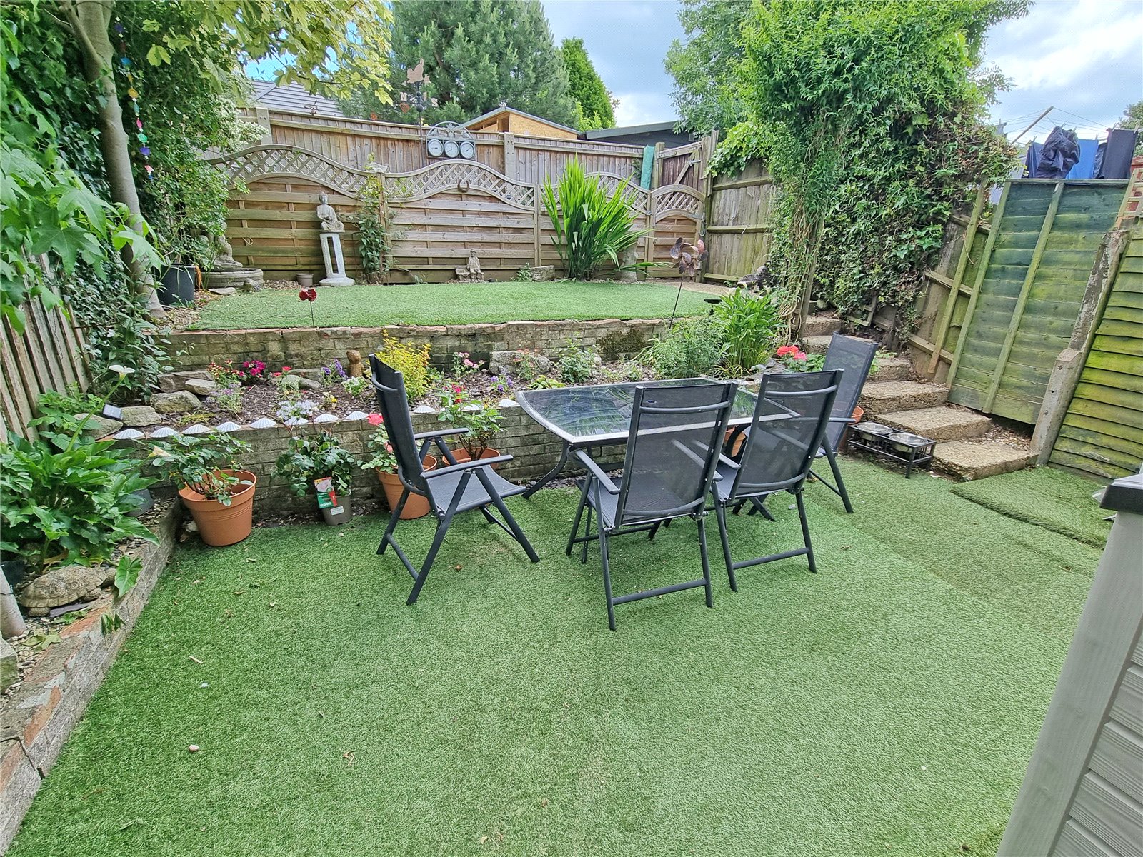 is mainly laid for ease of maintenance, being tiered with an area of astro-turf immediately abutting the rear with raised flower border. There are steps leading up to a further area of garden with astro-turf, enclosed by fencing and hedging with pedestrian access to the rear.