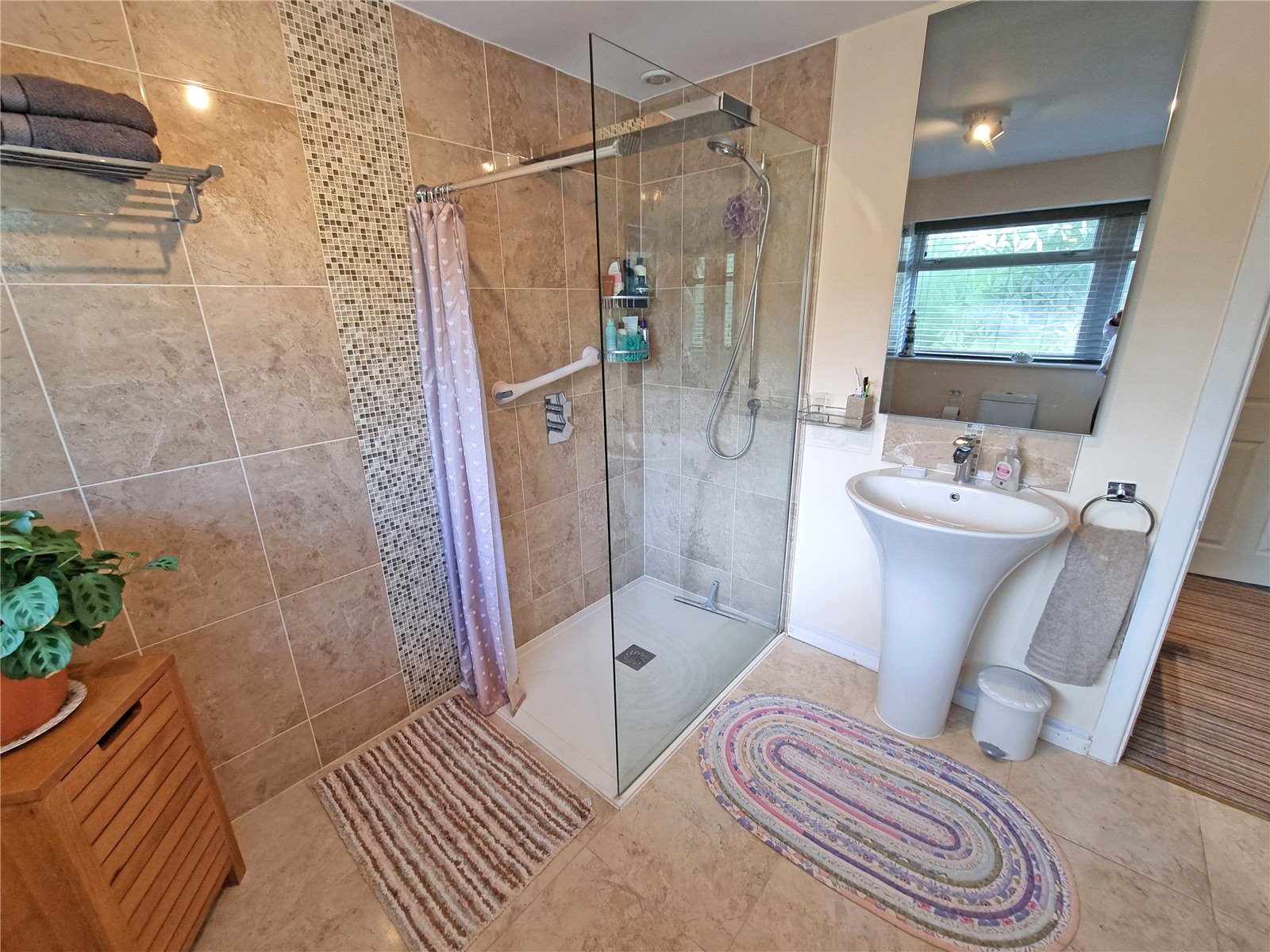 With large fully tiled walk in shower cubicle with two shower heads, low level dual flush w.c., wash hand basin with splashback with 3D mirror and light over, ladder style heated towel rail, ceiling light point, tiled flooring, underfloor heating, obscure double glazed window to rear aspect.