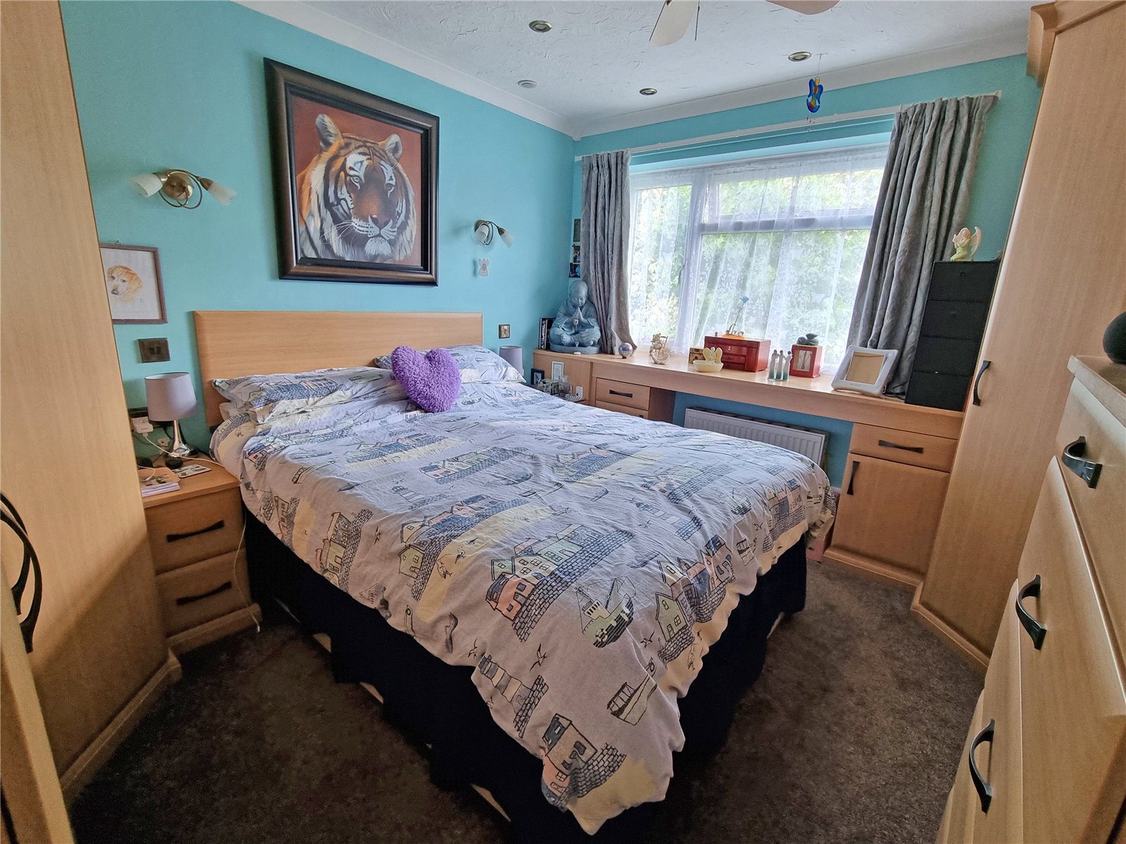 Excellent range of built in wardrobes, bedside tables and chest of drawers, inset ceiling downlighters, two wall light points, double glazed window to rear aspect.